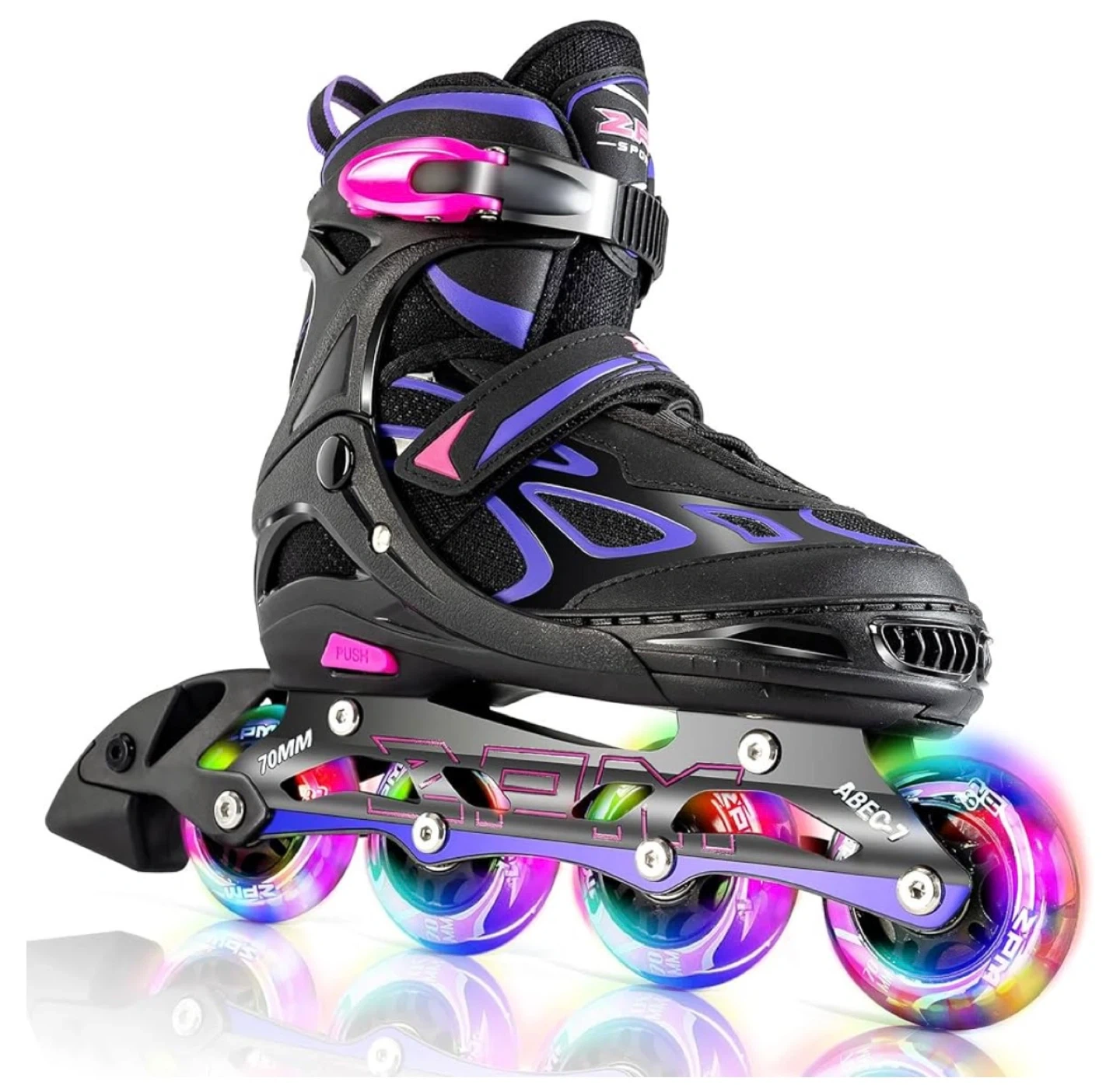 These inline skates feature a secure buckle and strap system for a snug fit. The wheels are 70mm and light up when in motion. ABEC-7 bearings provide a smooth ride.