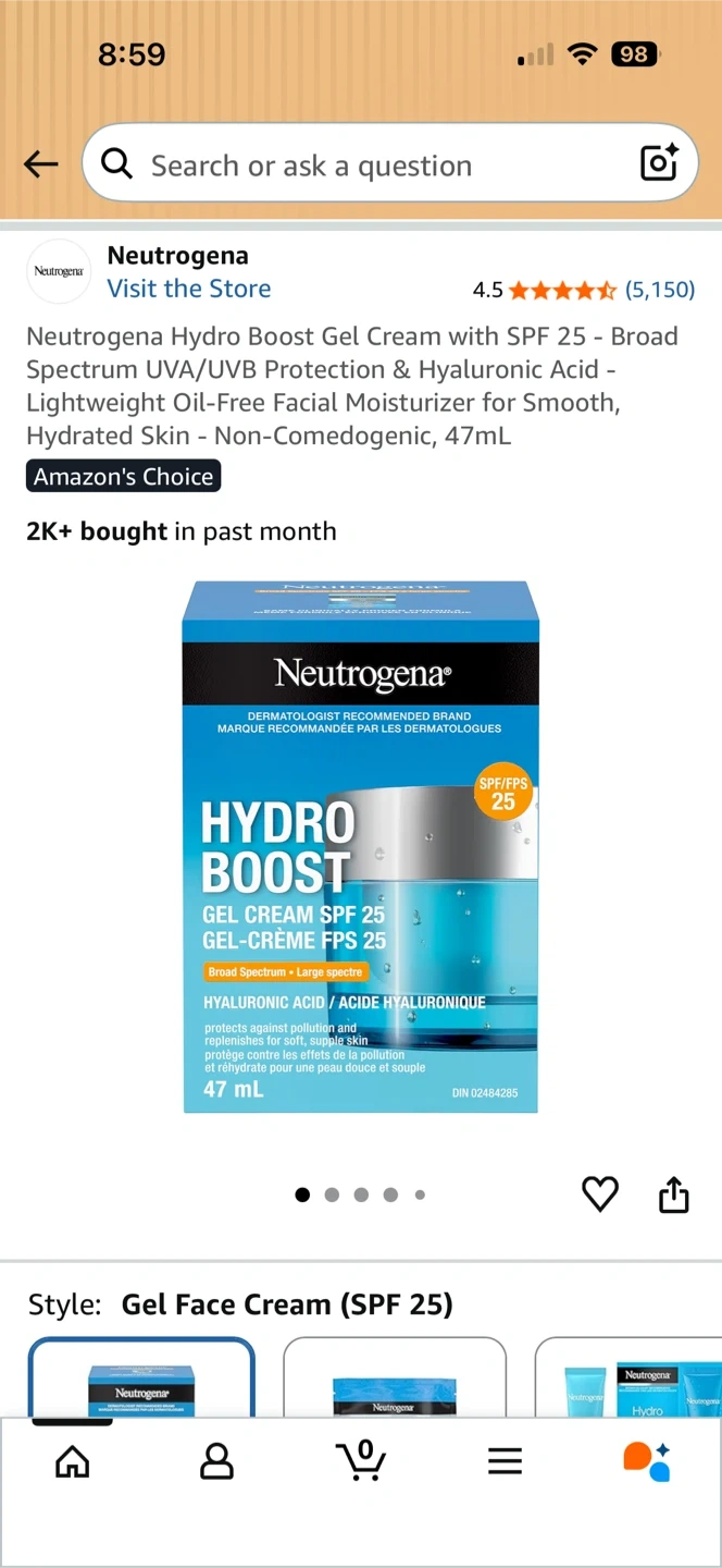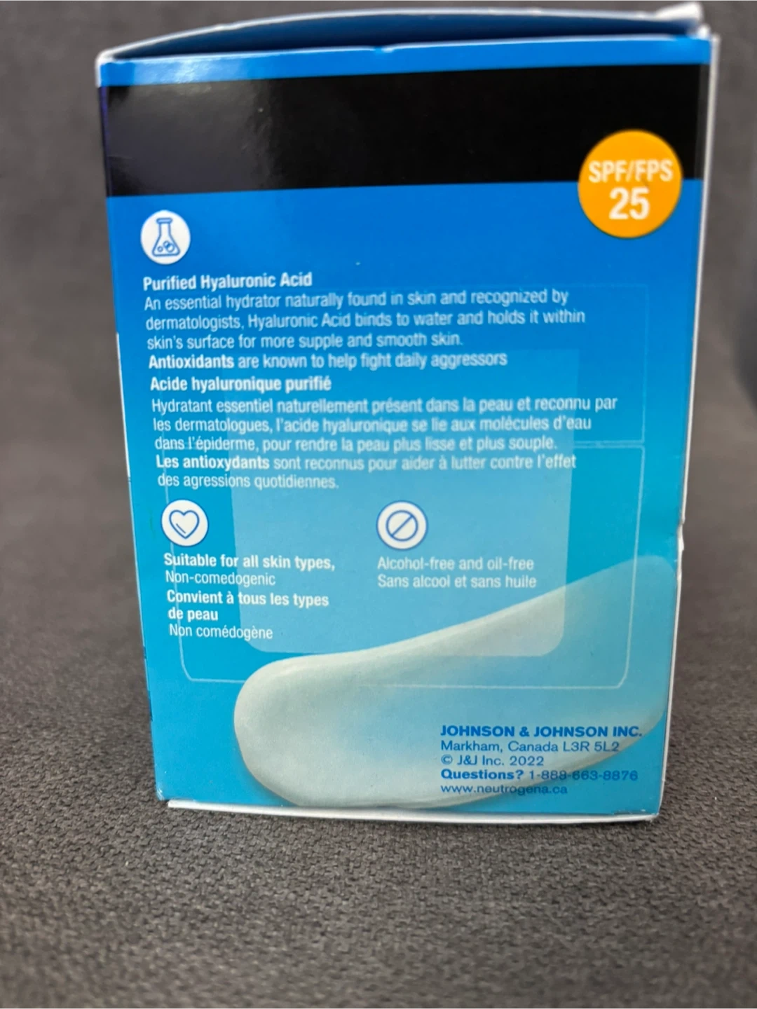 Neutrogena Hydro Boost Gel Cream with SPF 25. It's a lightweight, oil-free facial moisturizer. Purified Hyaluronic Acid hydrates skin and antioxidants fight daily aggressors. Suitable for all skin types and non-comedogenic.