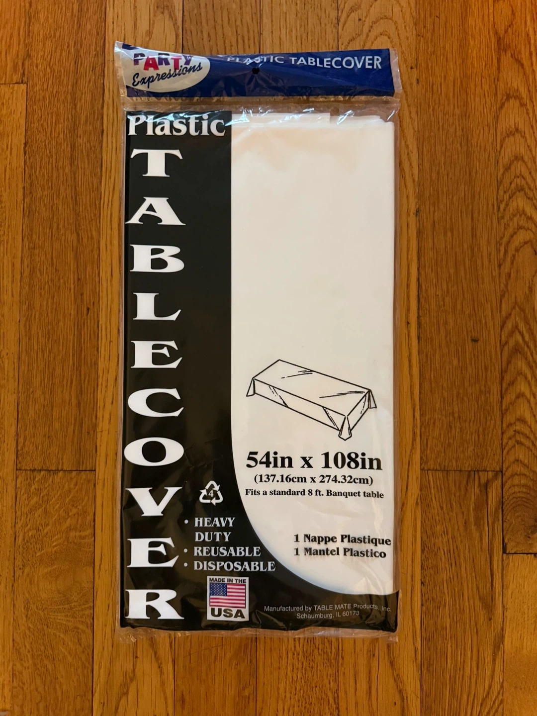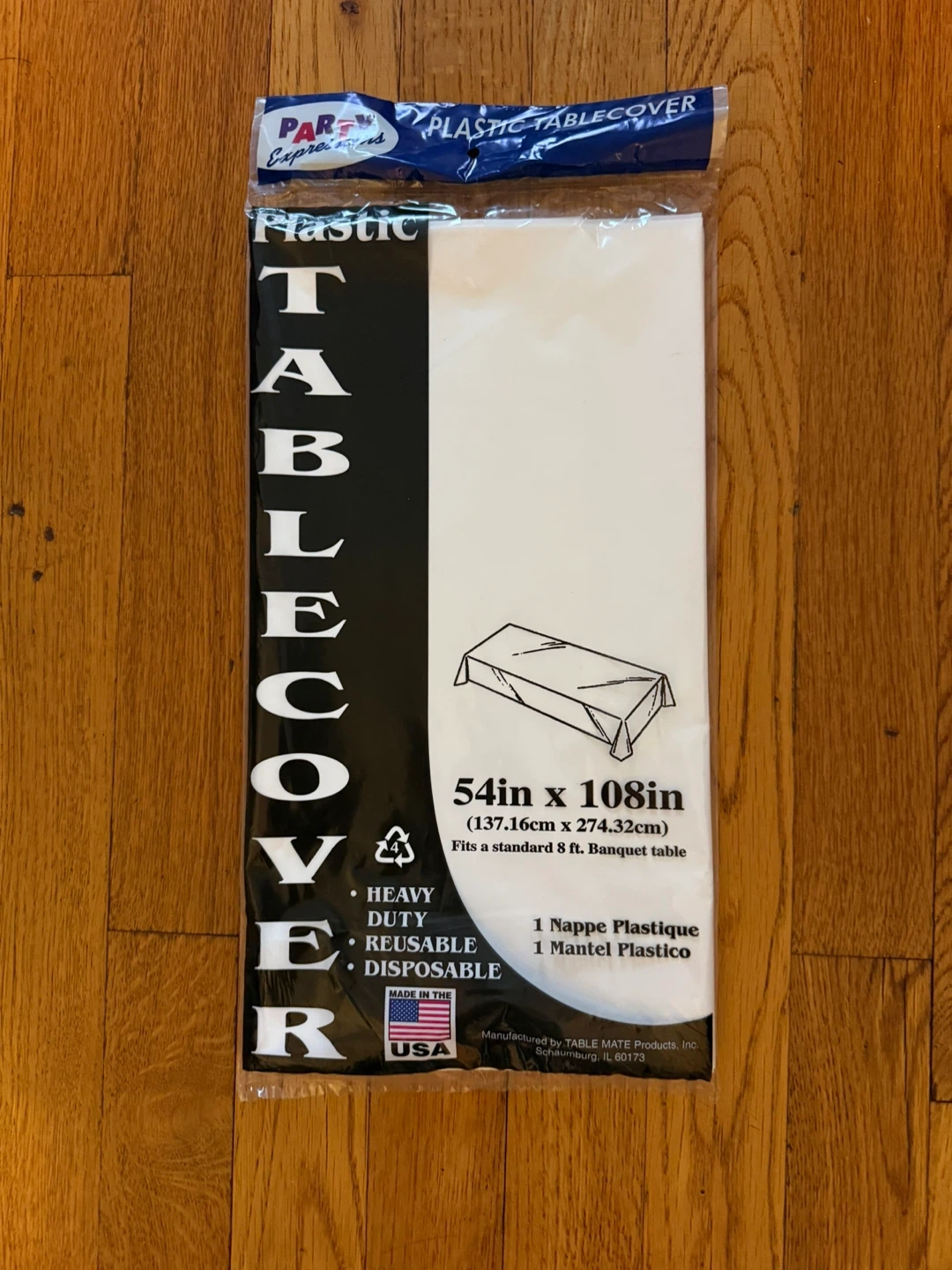 Giving away a Party Expressions plastic tablecover, still in its original packaging! It's white and measures 54 inches by 108 inches, which fits a standard 8 ft banquet table. It's heavy duty, reusable, and disposable, making it a versatile option for parties or events.