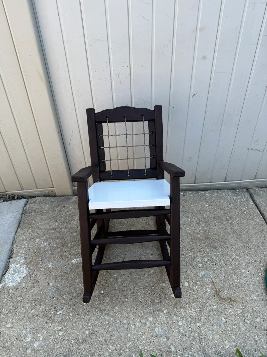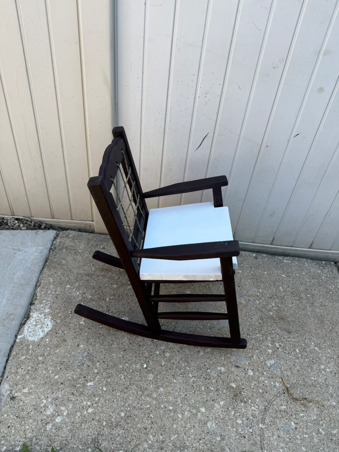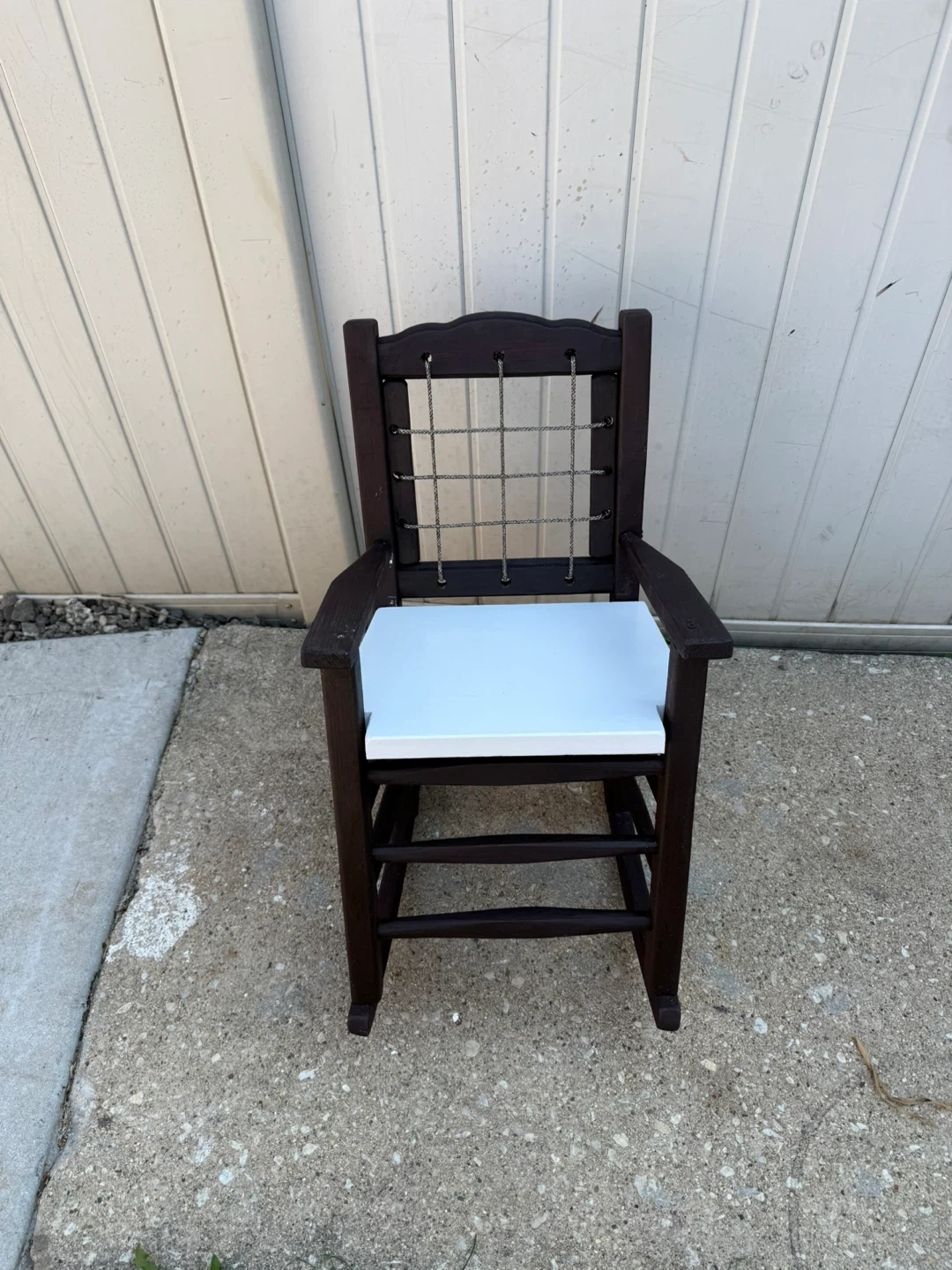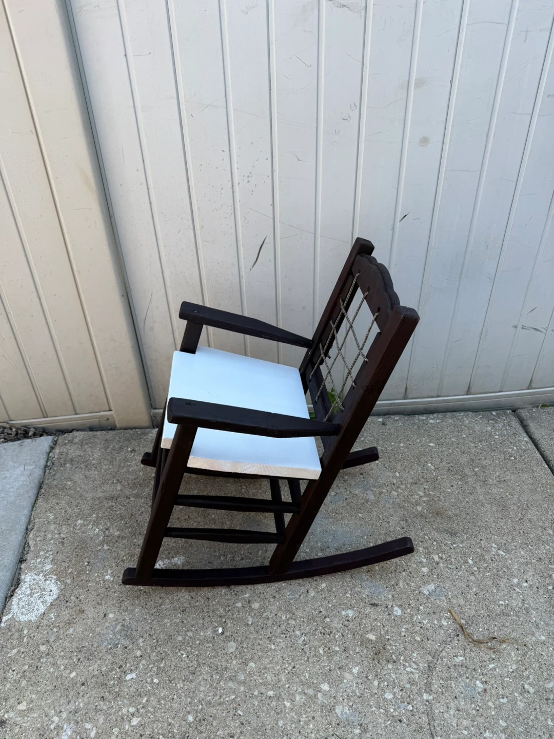 Selling a cute child's rocking chair! It's a dark brown color with a white seat. Perfect for a little one's room or playroom
