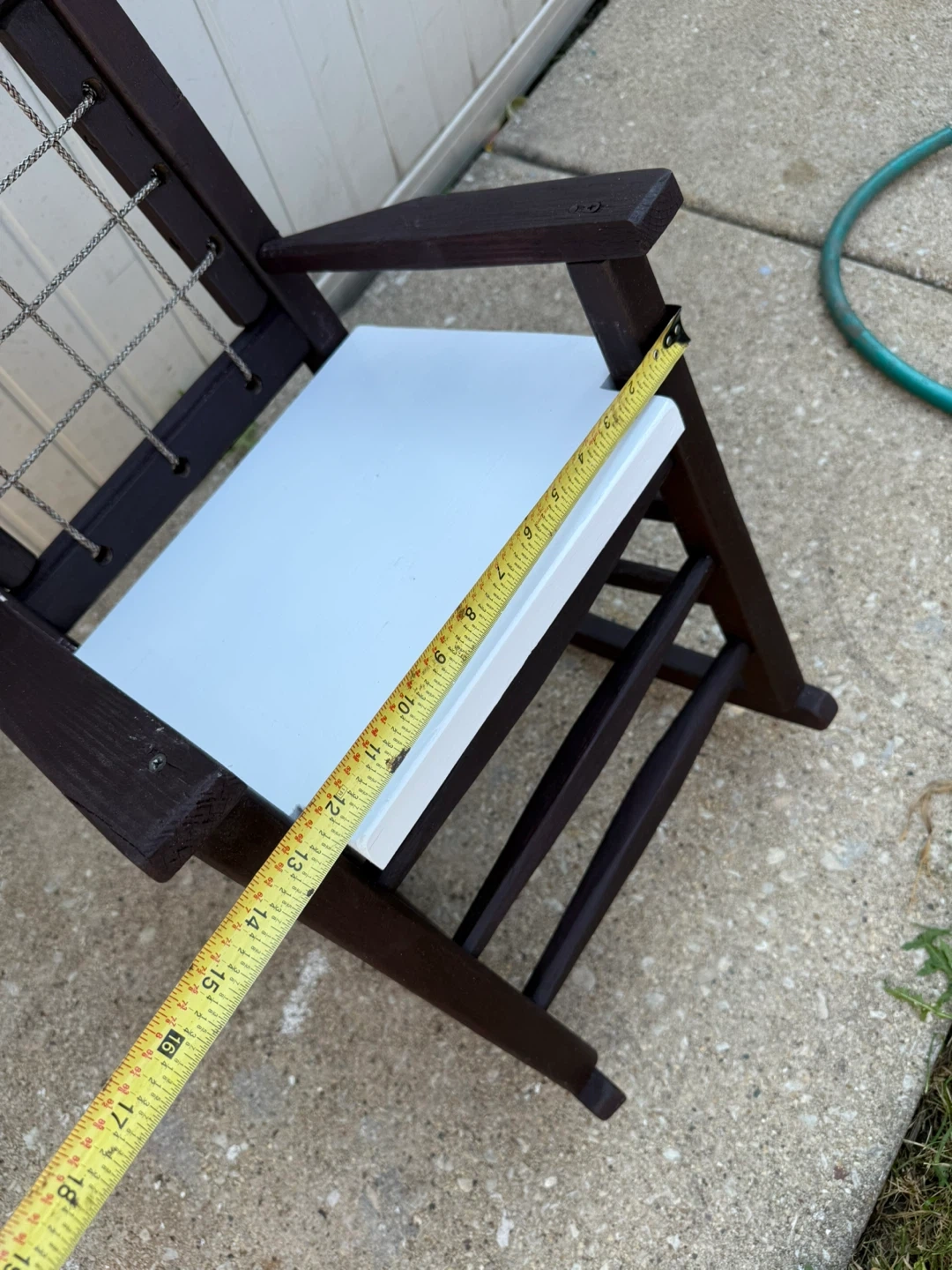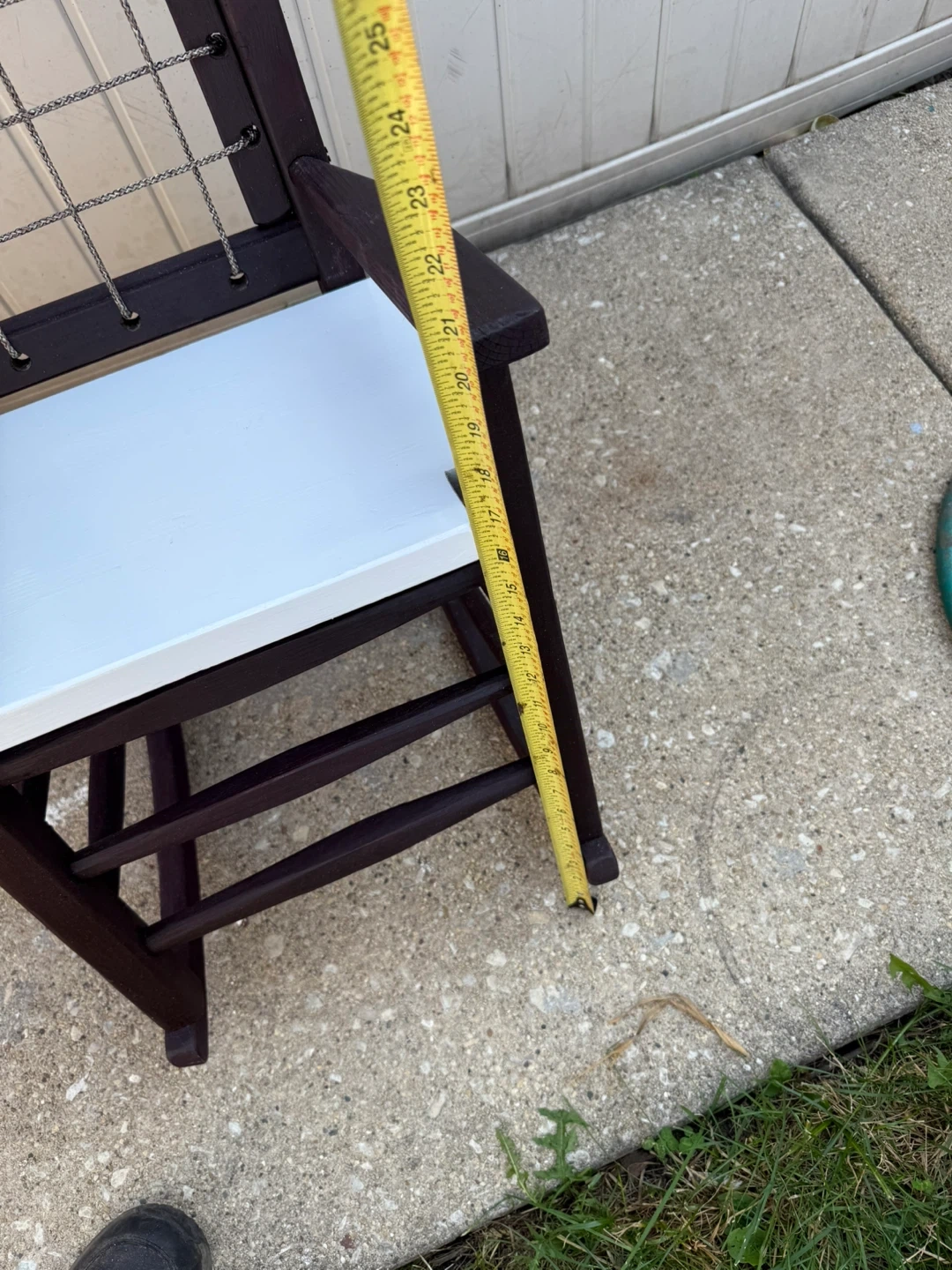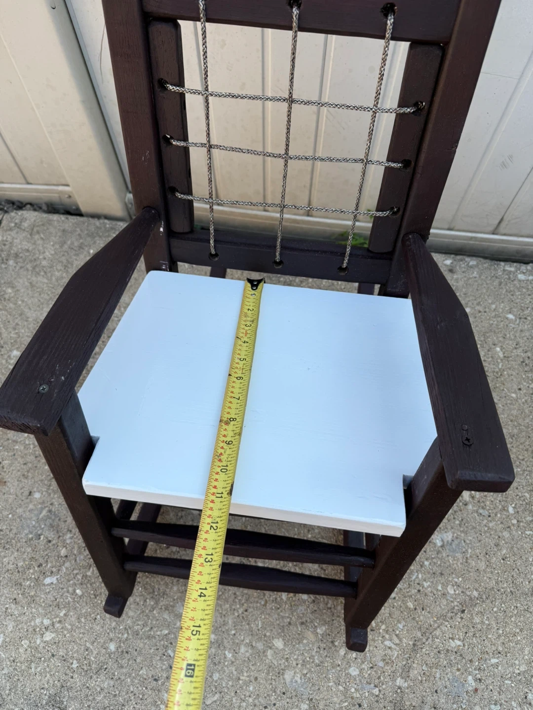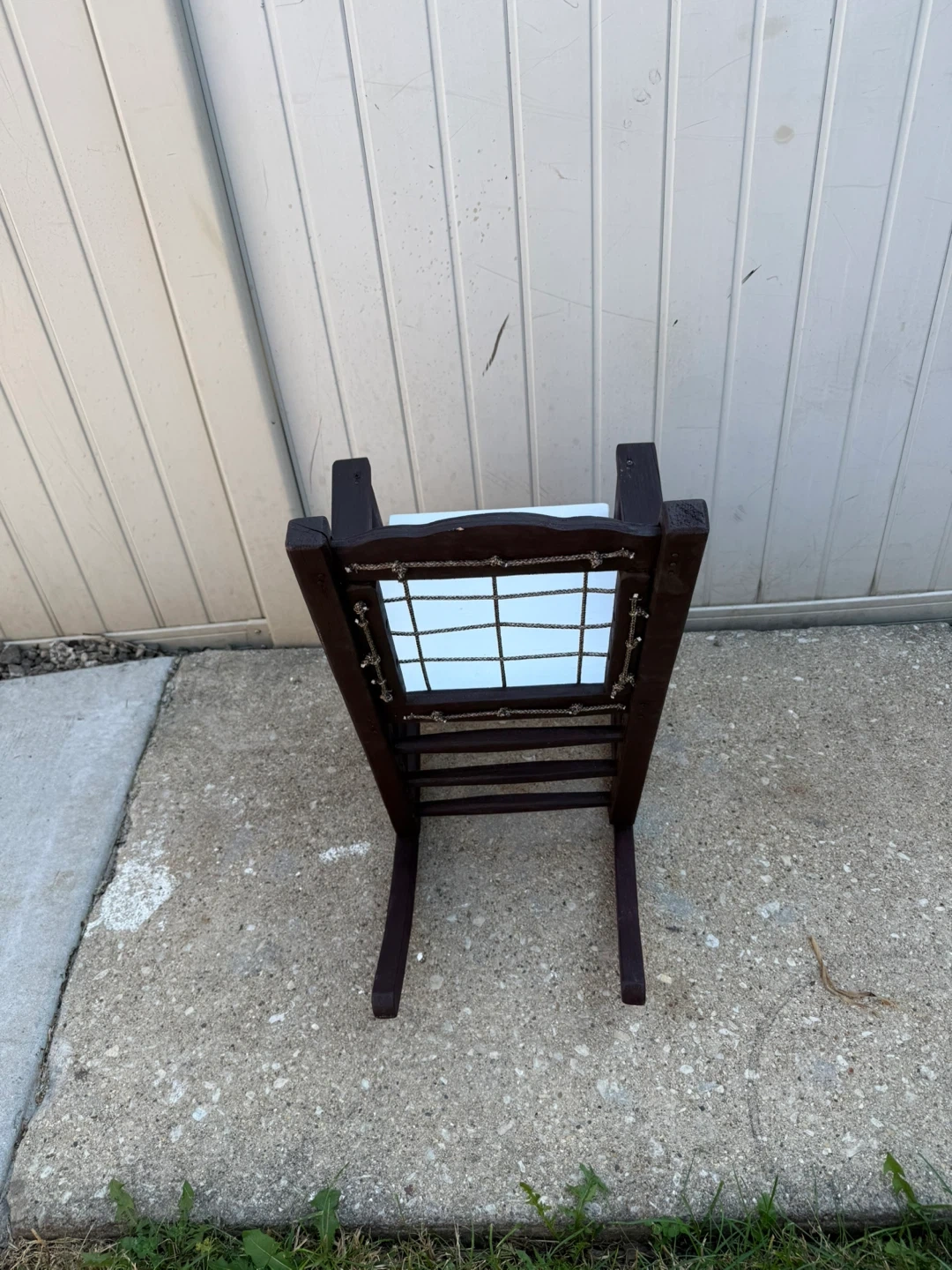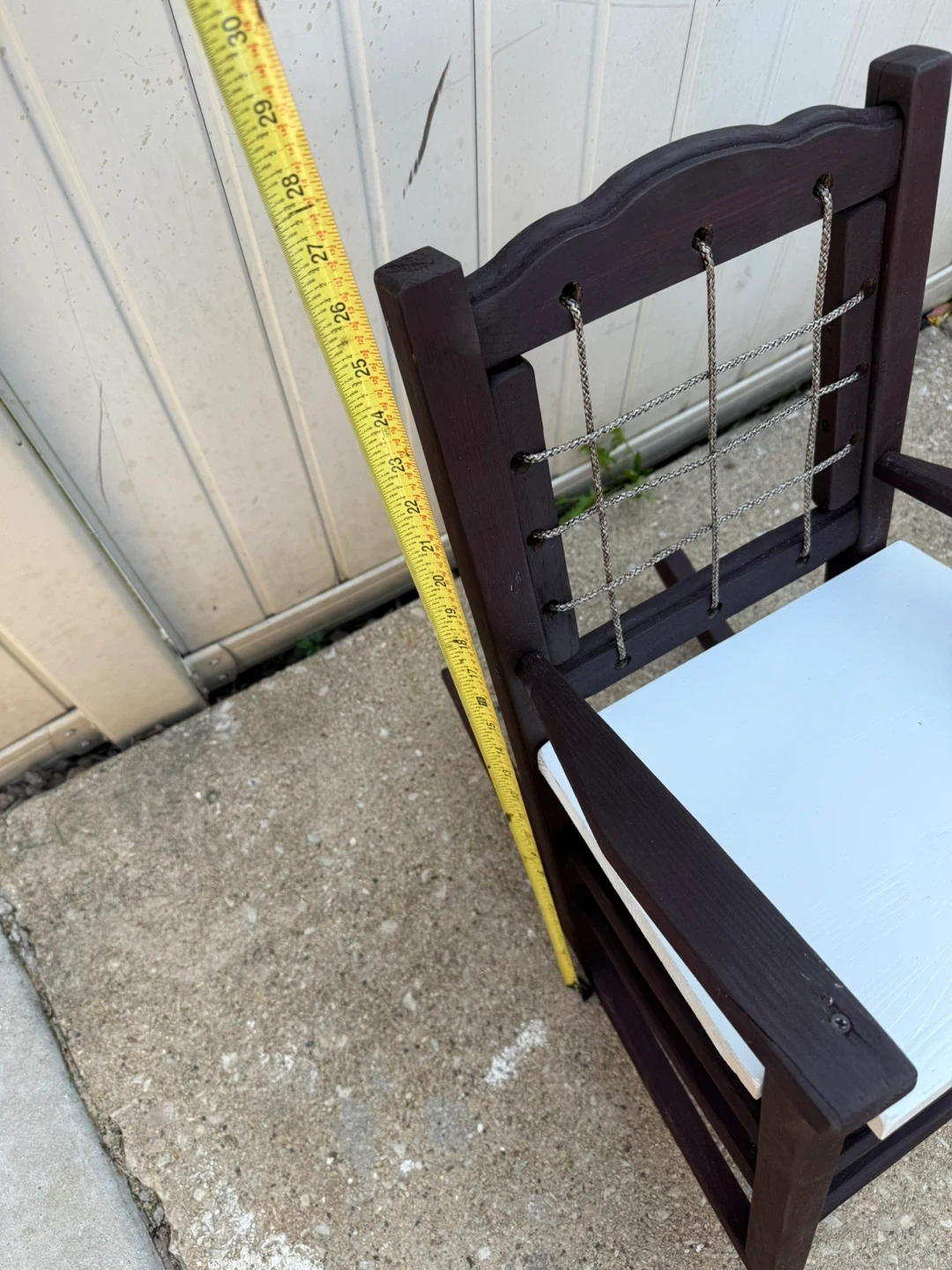 Selling a cute child's rocking chair! It's a dark brown color with a white seat. Perfect for a little one's room or playroom