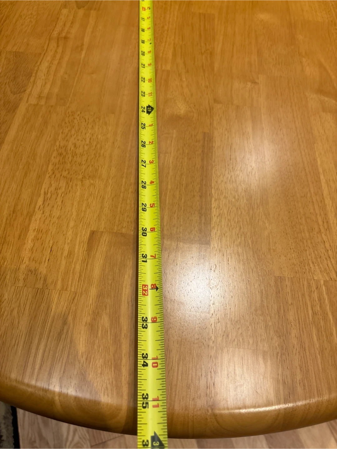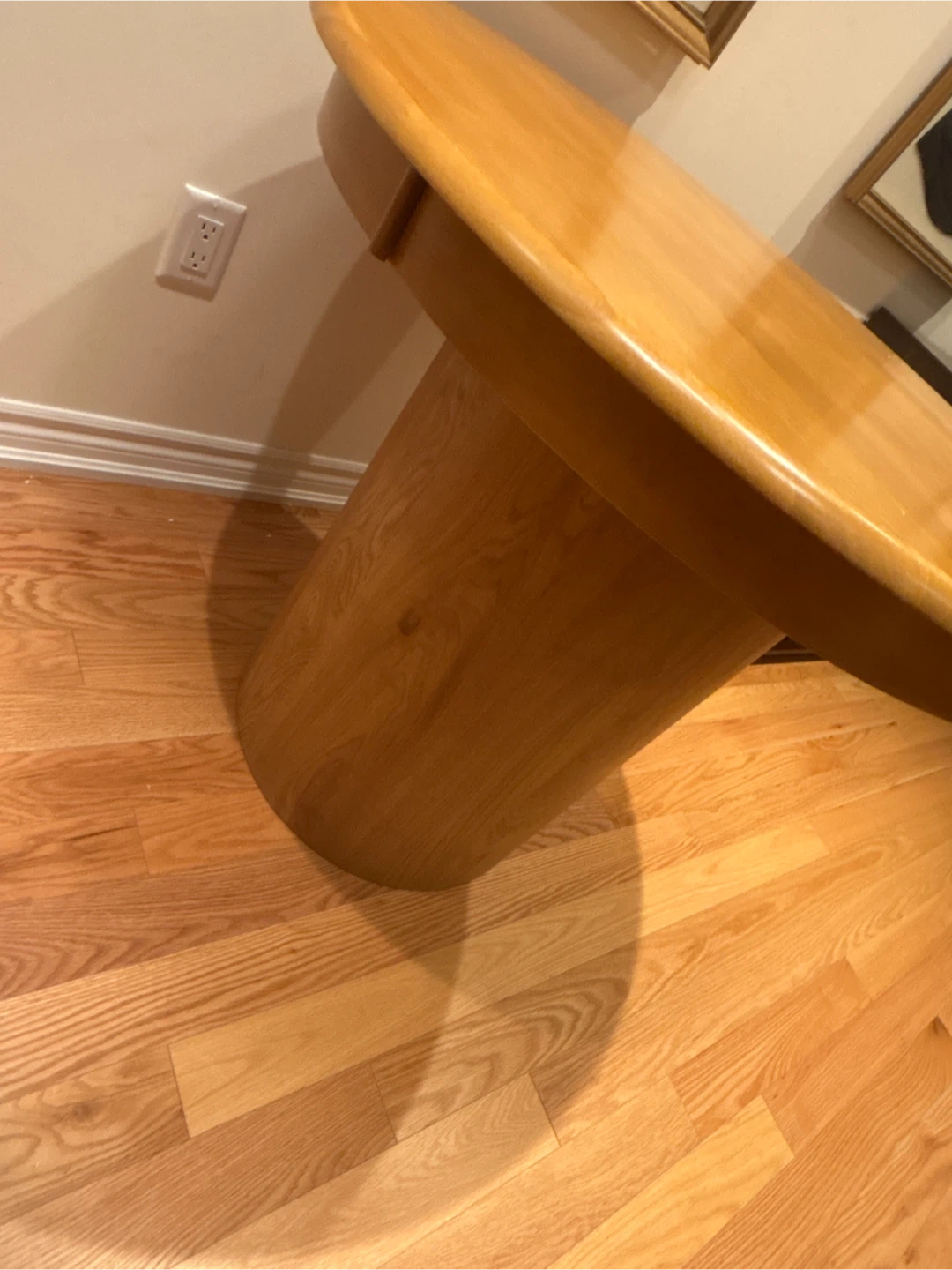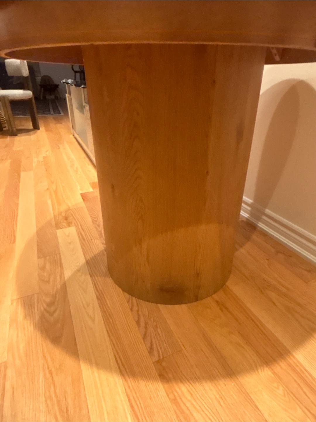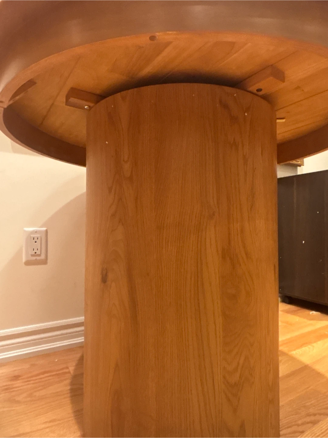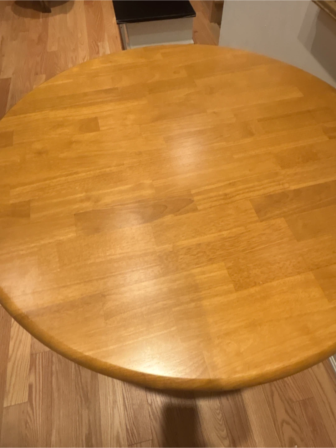 Two Tone Solid Round wooden dining table. The table top measures approximately 35 inches in diameter. It would be a great addition to any dining space.