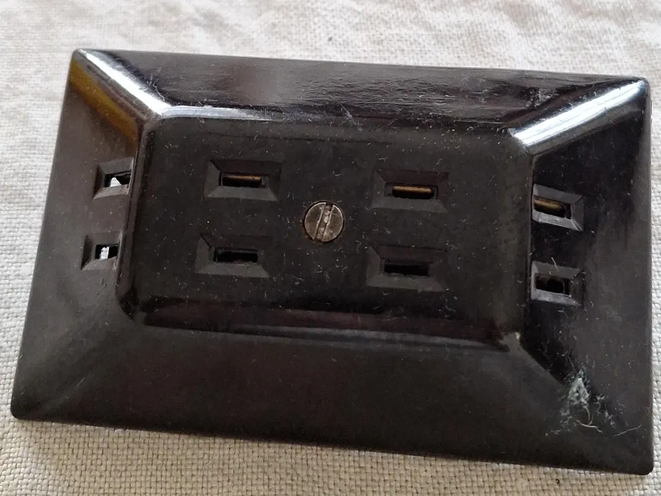 This is a vintage dark brown bakelite double electrical outlet receptacle. It's a standard duplex receptacle with four slots. Great for replacing an old or broken outlet!
