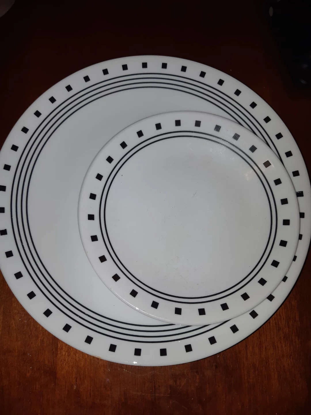 Set of Corelle plates made from Vitrelle glass. They're break and chip resistant. Great for everyday use! 3 big and 3 small plates