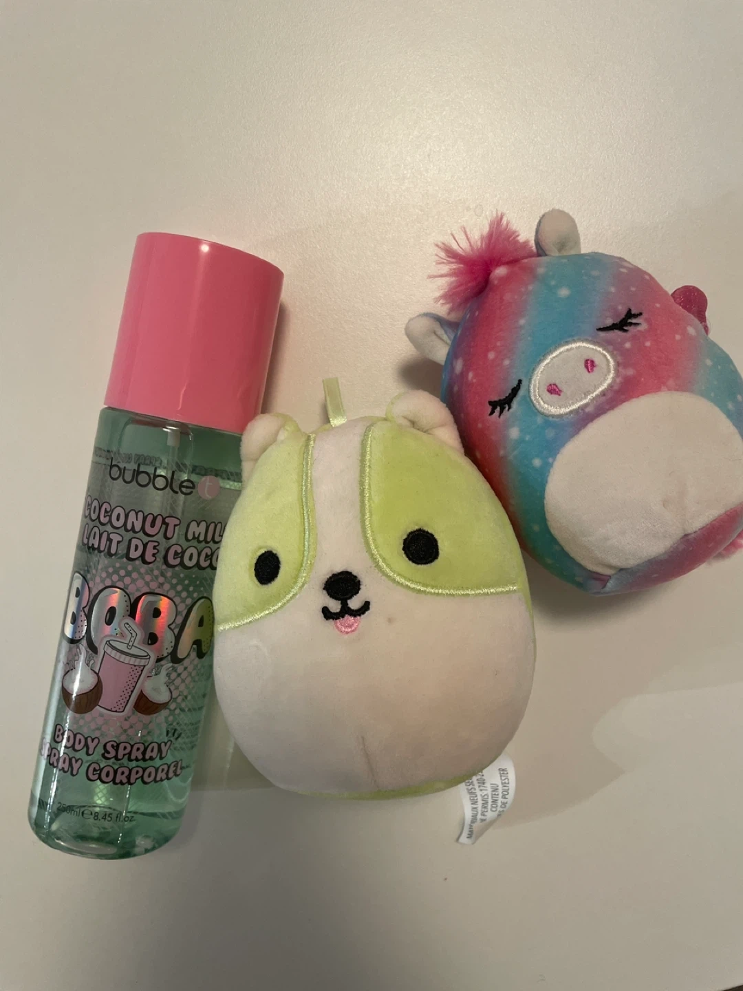 Selling a Bubble T Coconut Milk Boba Body Spray. Apparently I don’t like the smell of coconut. I sprayed it once to try, but other than that it’s 99.9% full. The bottle contains 250ml or 8.45 fl.oz. I’m also attaching those two squishmallows. Pickup only, from Seton (I don’t deliver, I don’t have a car). Cash only, thank you!