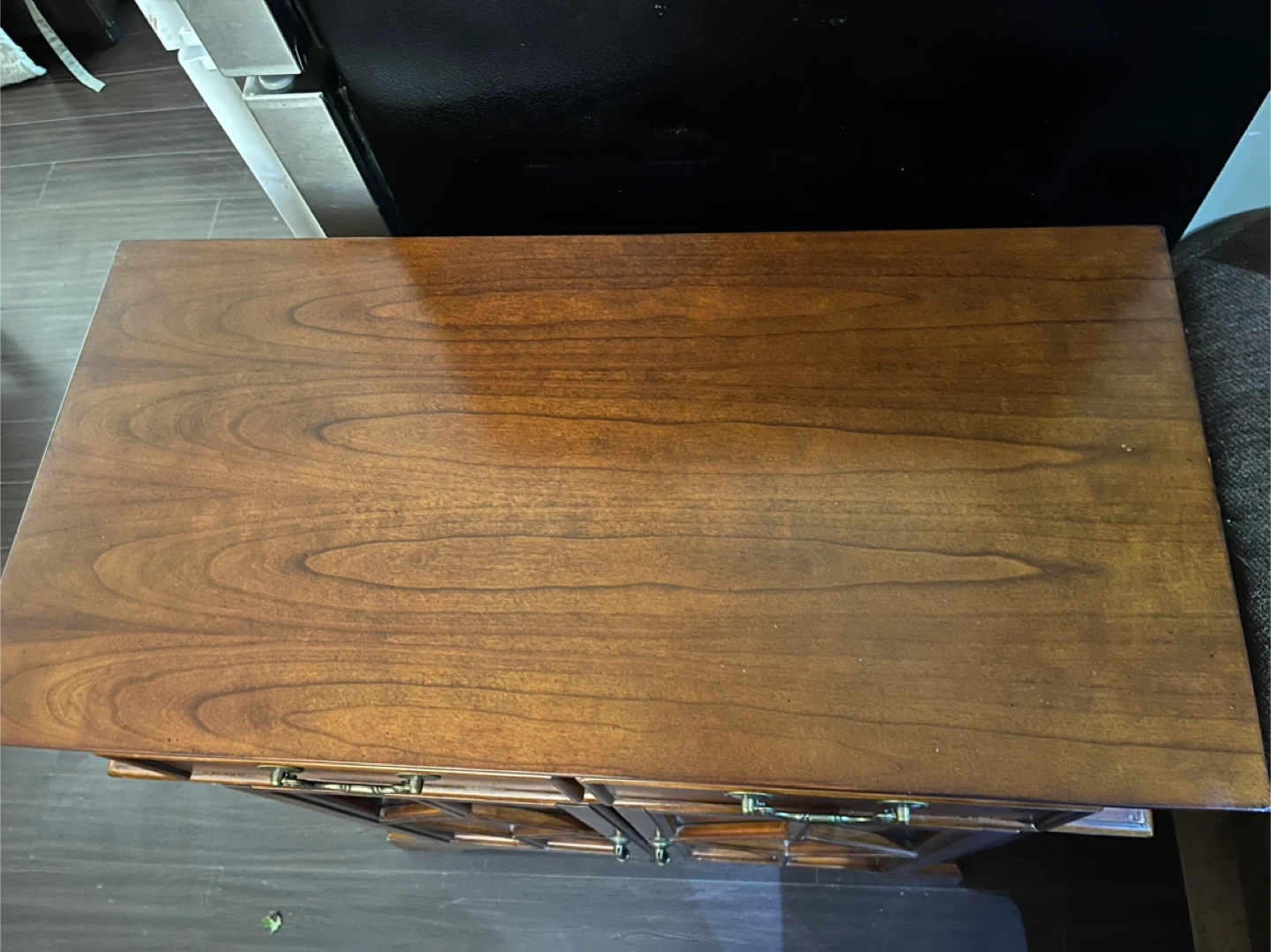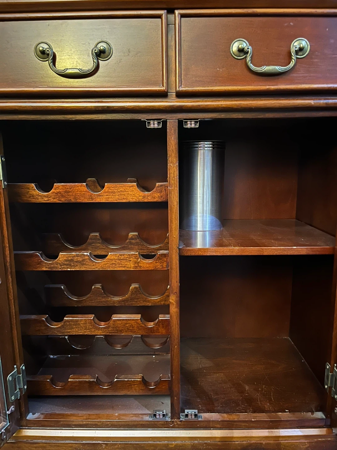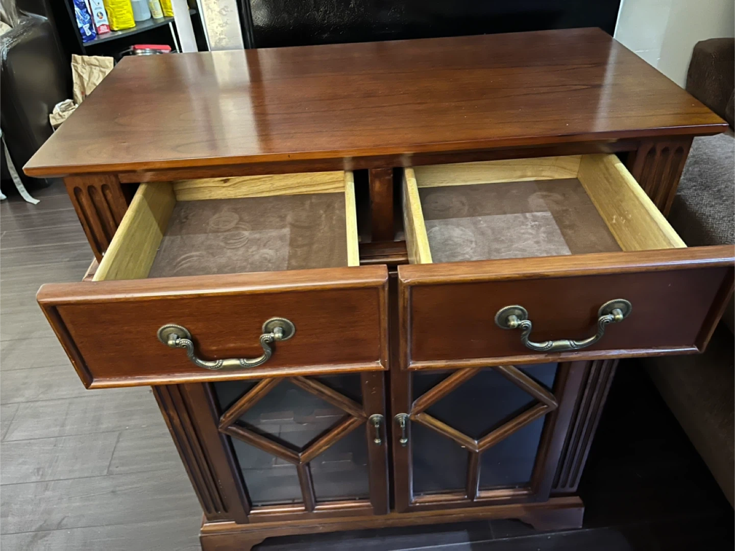 Selling a wooden cabinet with glass doors. It has two drawers on top and doors with a diamond design on the glass. It's a lovely piece for any room!