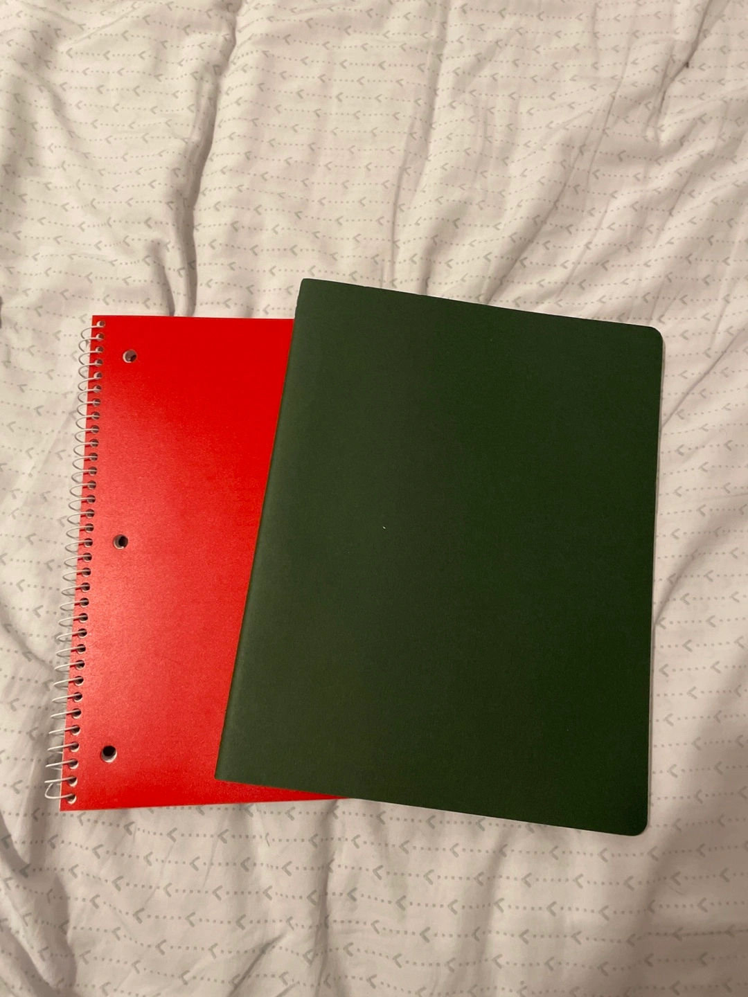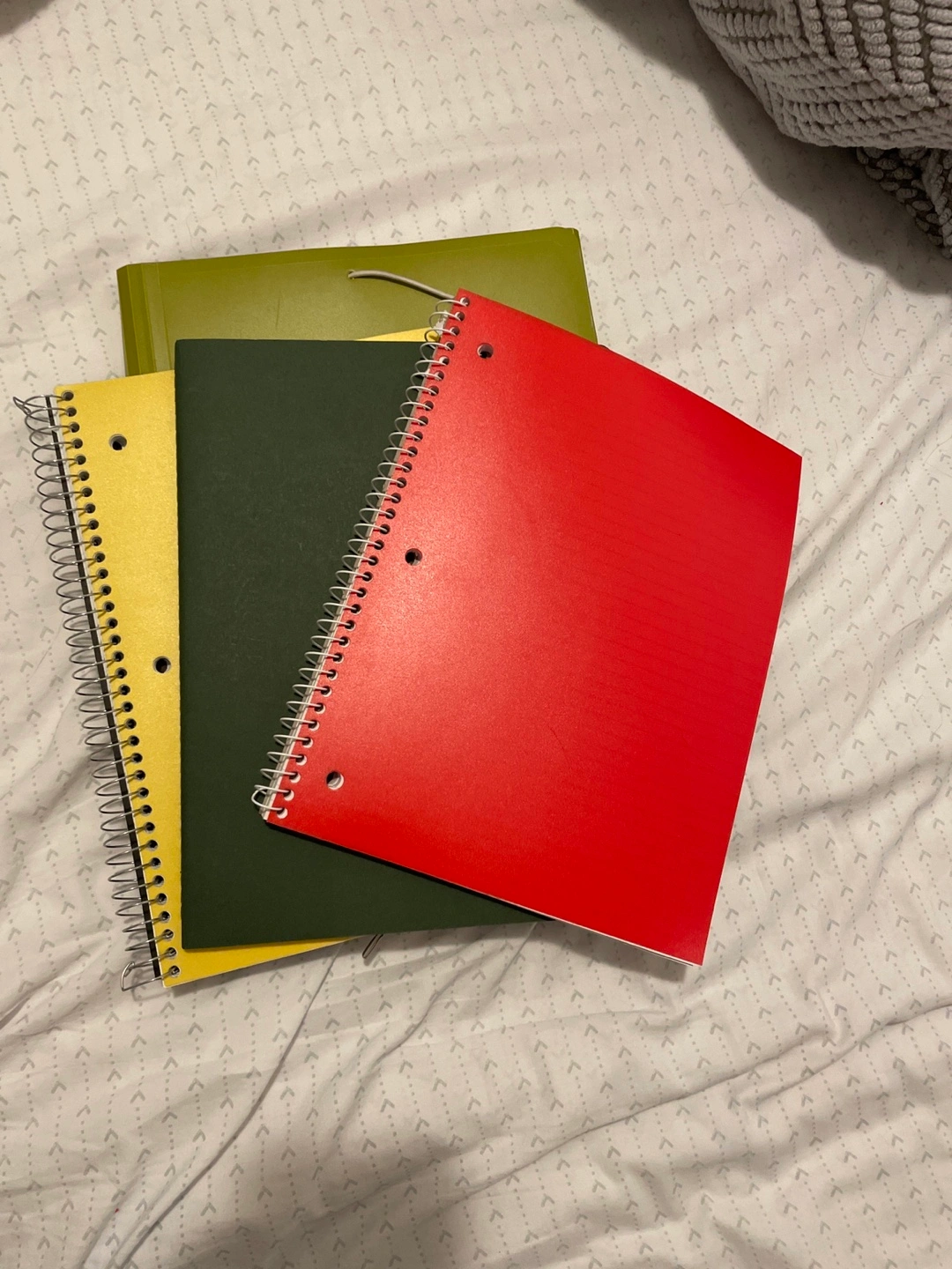 Three spiral notebooks: red, dark green, and yellow. One green portfolio. College ruled. Good for school or organization.