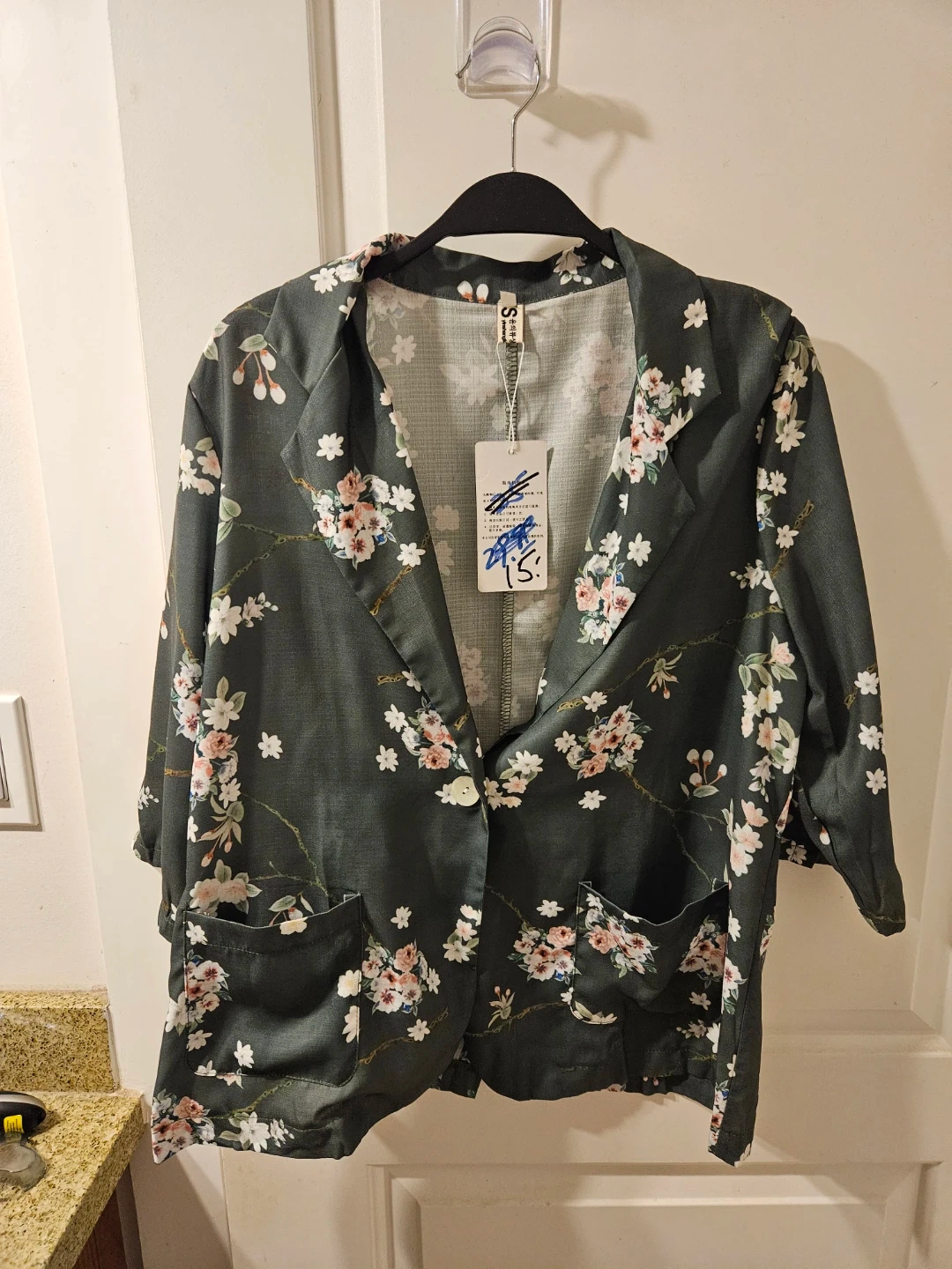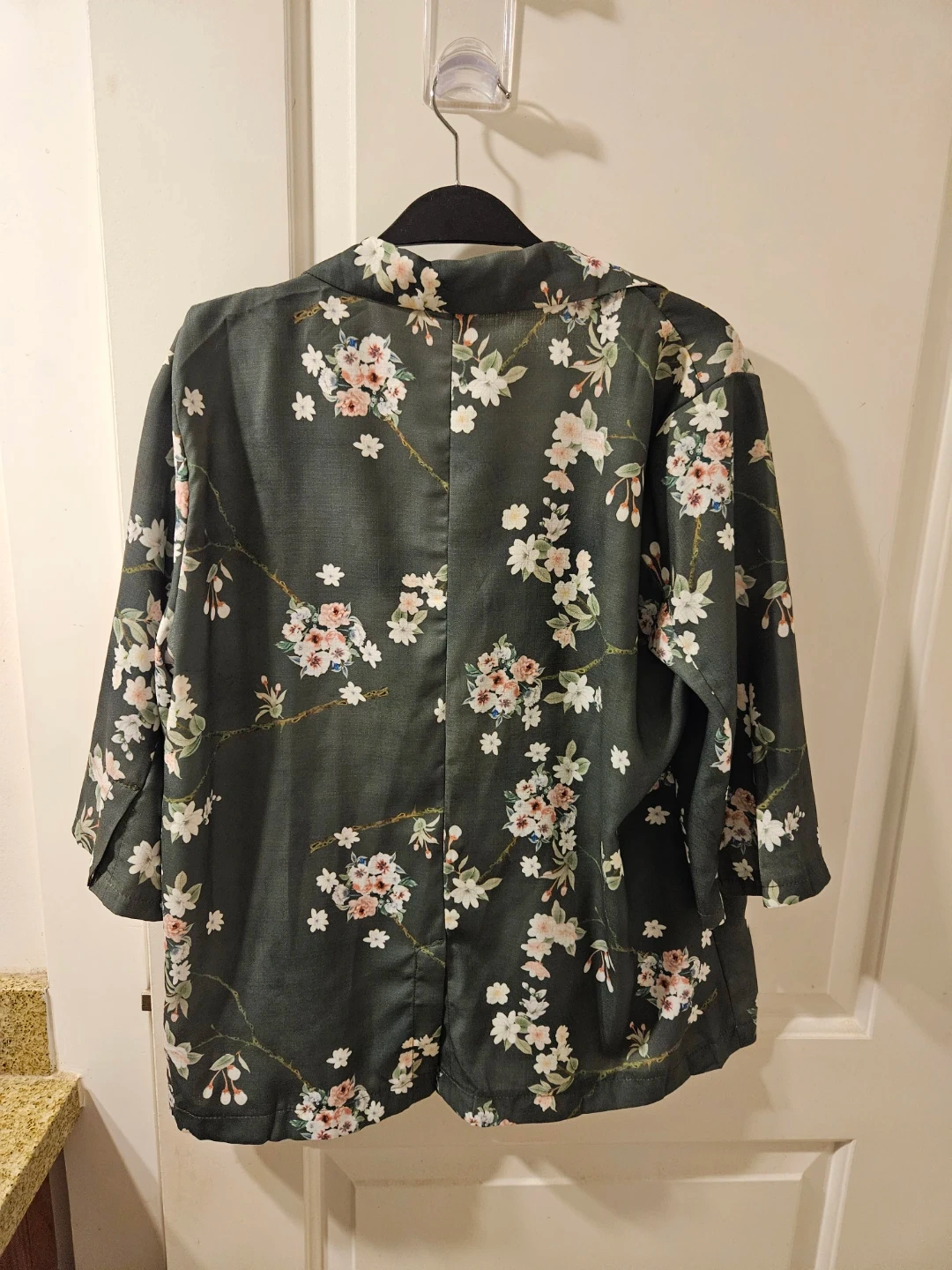 This stylish blazer features a beautiful dark green floral print. It has a single button closure and two front pockets. Short sleeves.