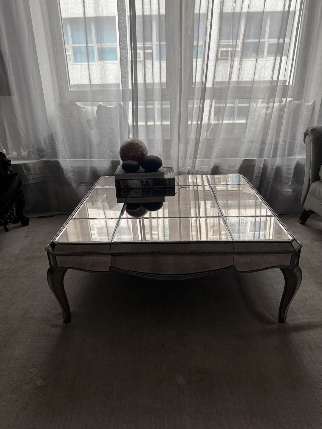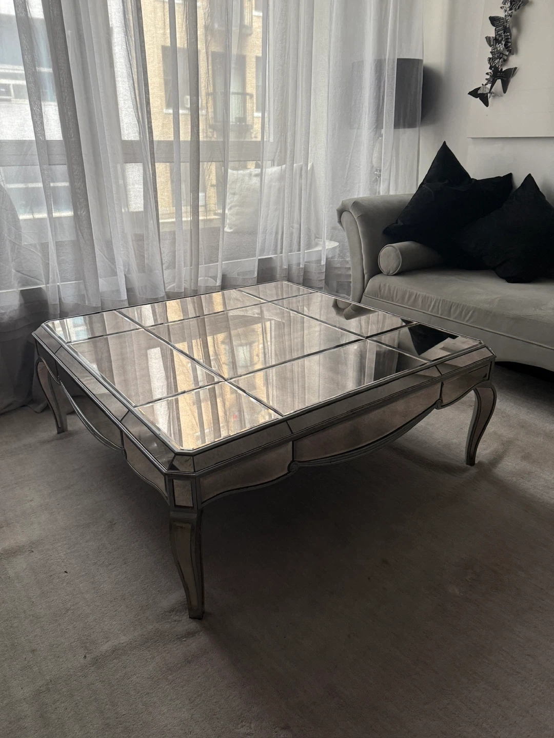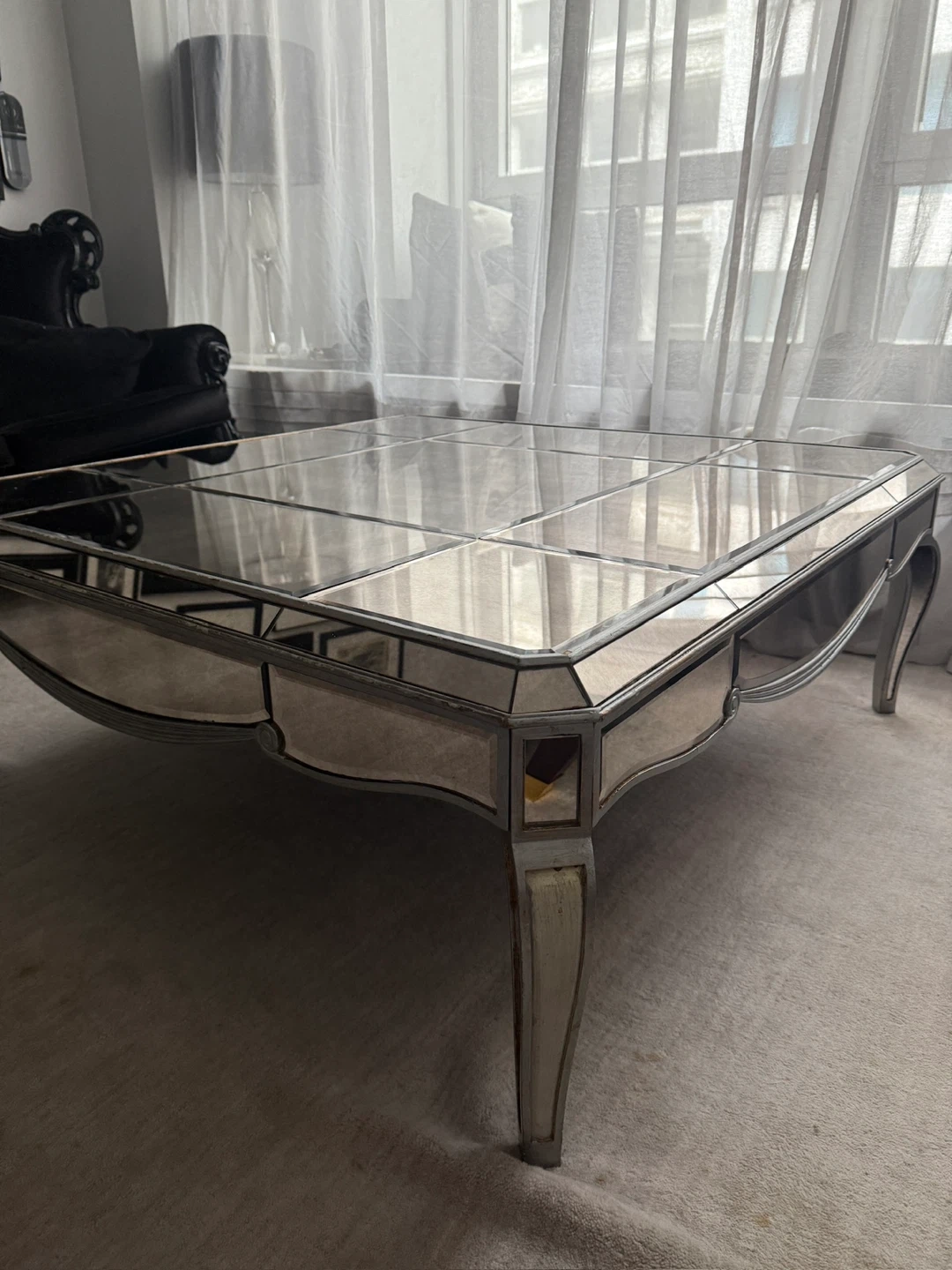 This mirrored coffee table features a paneled glass top with decorative carved legs. It's a square table with silver trim. This would add a touch of glamour to any living room!