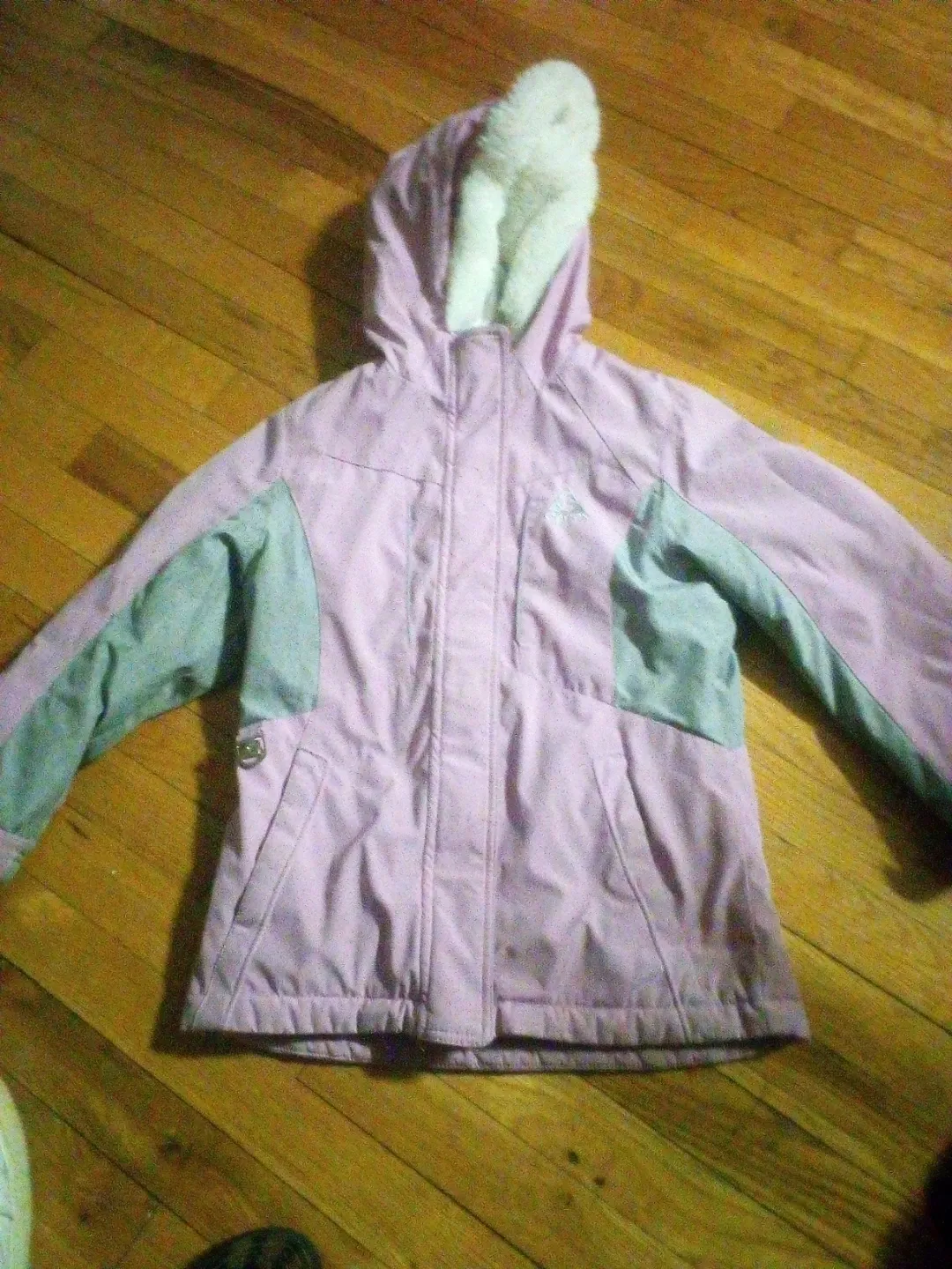 This girls' jacket features a pink body with gray accents. It has a full-zip front and a faux-fur lined hood. A nice layer for cooler weather!