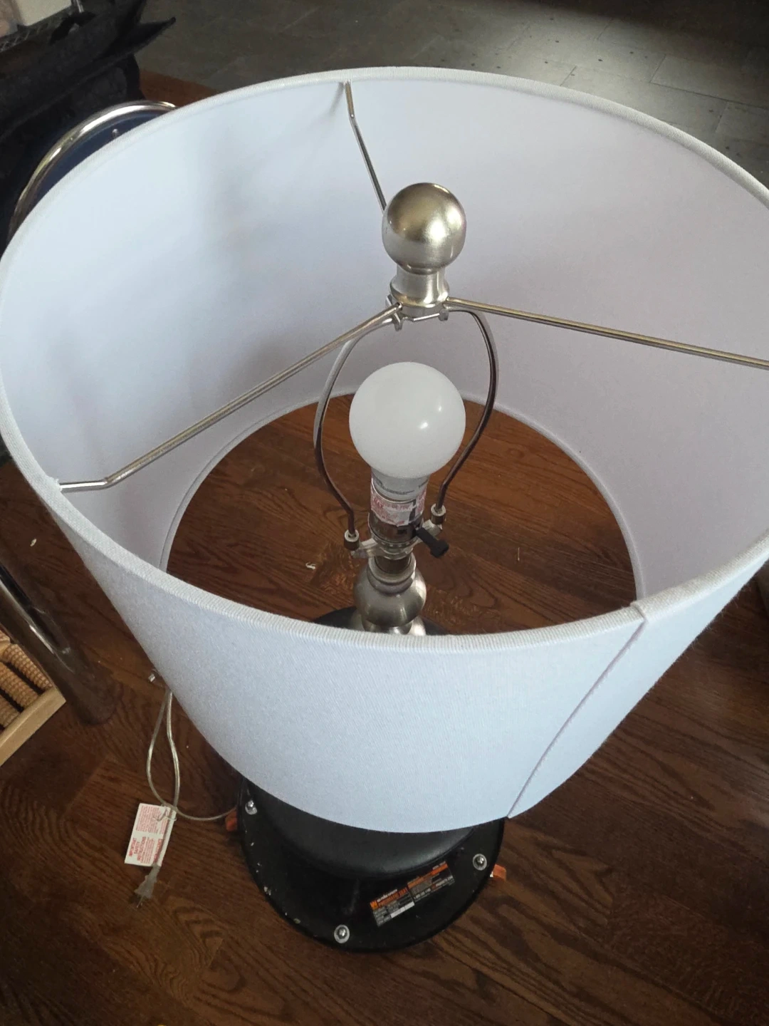 This table lamp features a brushed nickel base with a decorative ball design on the stem. It includes a white drum fabric shade. The lamp requires one bulb and has a standard on/off switch. It's a nice addition to any room!