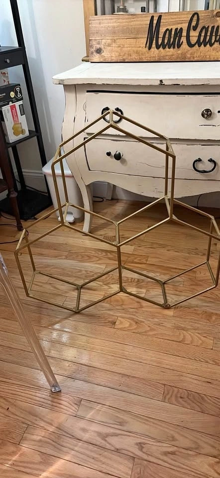 Stylish gold wine rack with a cool geometric hexagon design. Holds multiple wine bottles. Great for kitchen or bar area. Hell’s Kitchen pickup.