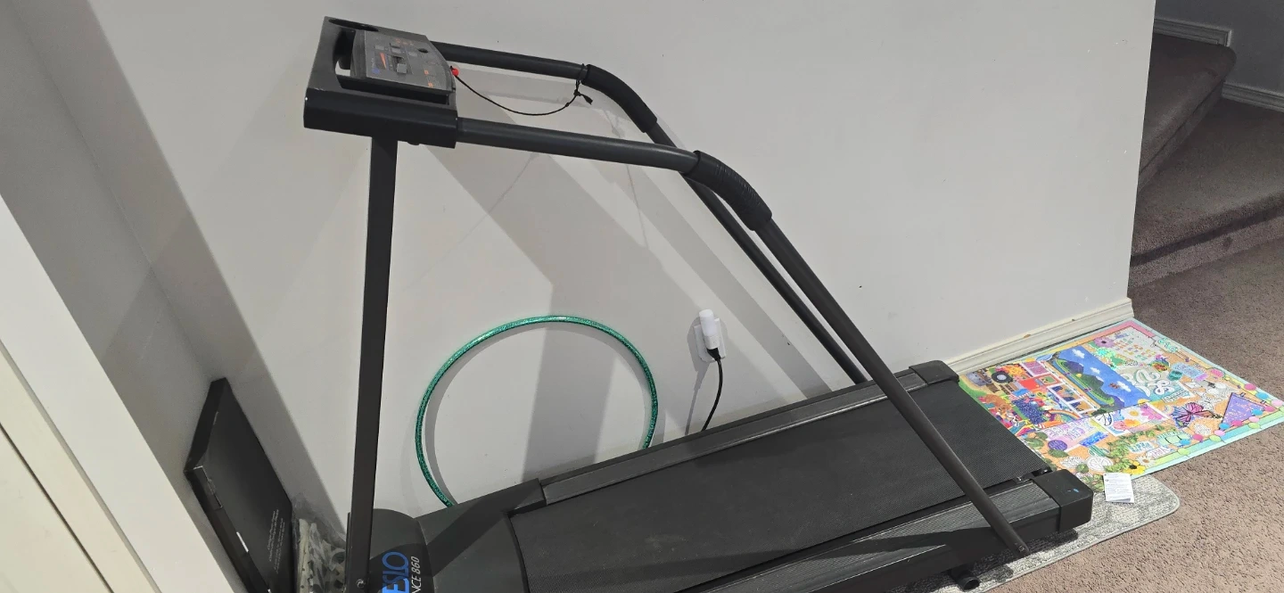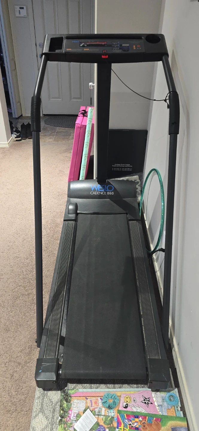 This is a Weslo Cadence 860 treadmill. It has a digital display for fitness tracking. The running belt is black. It's a great machine for home workouts!