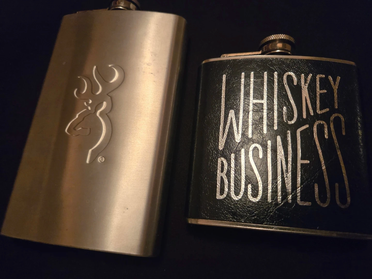 Selling a set of two flasks! One is a Browning flask with the brand's logo. The other is a black flask with 'Whiskey Business' printed on it. Both are in good condition and ready for your next adventure or cozy night in.