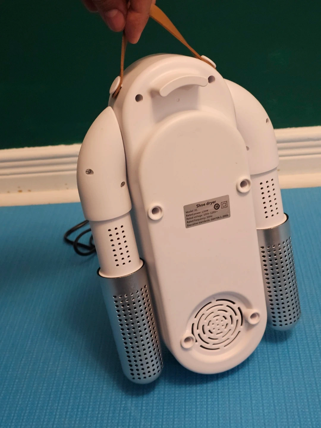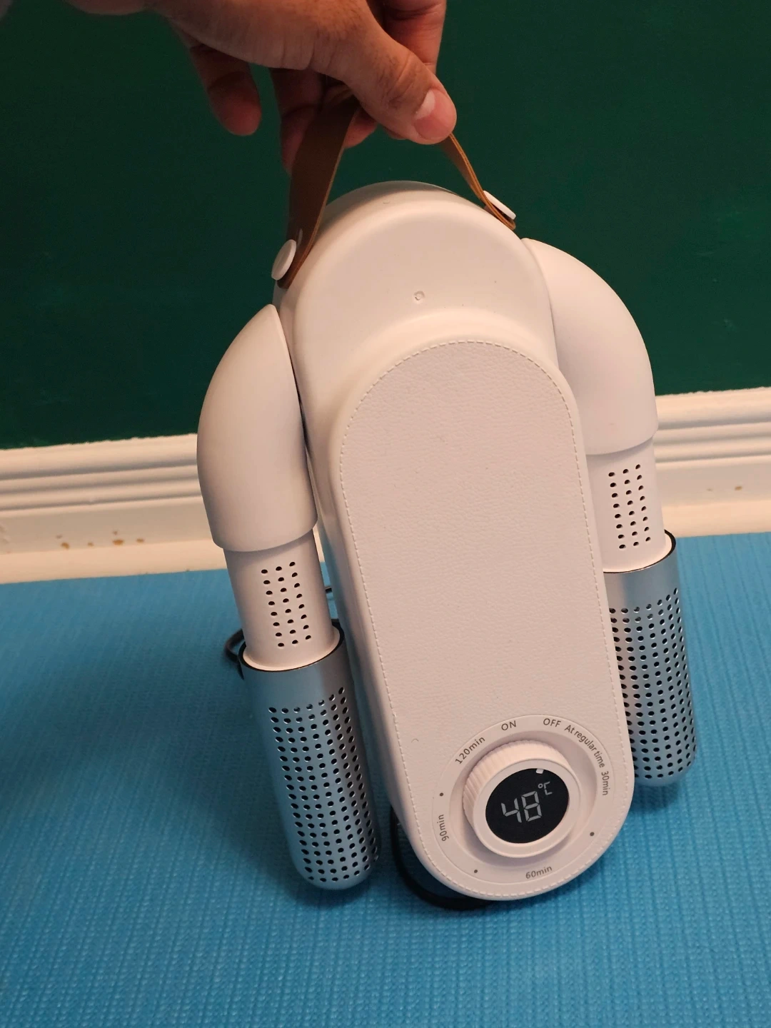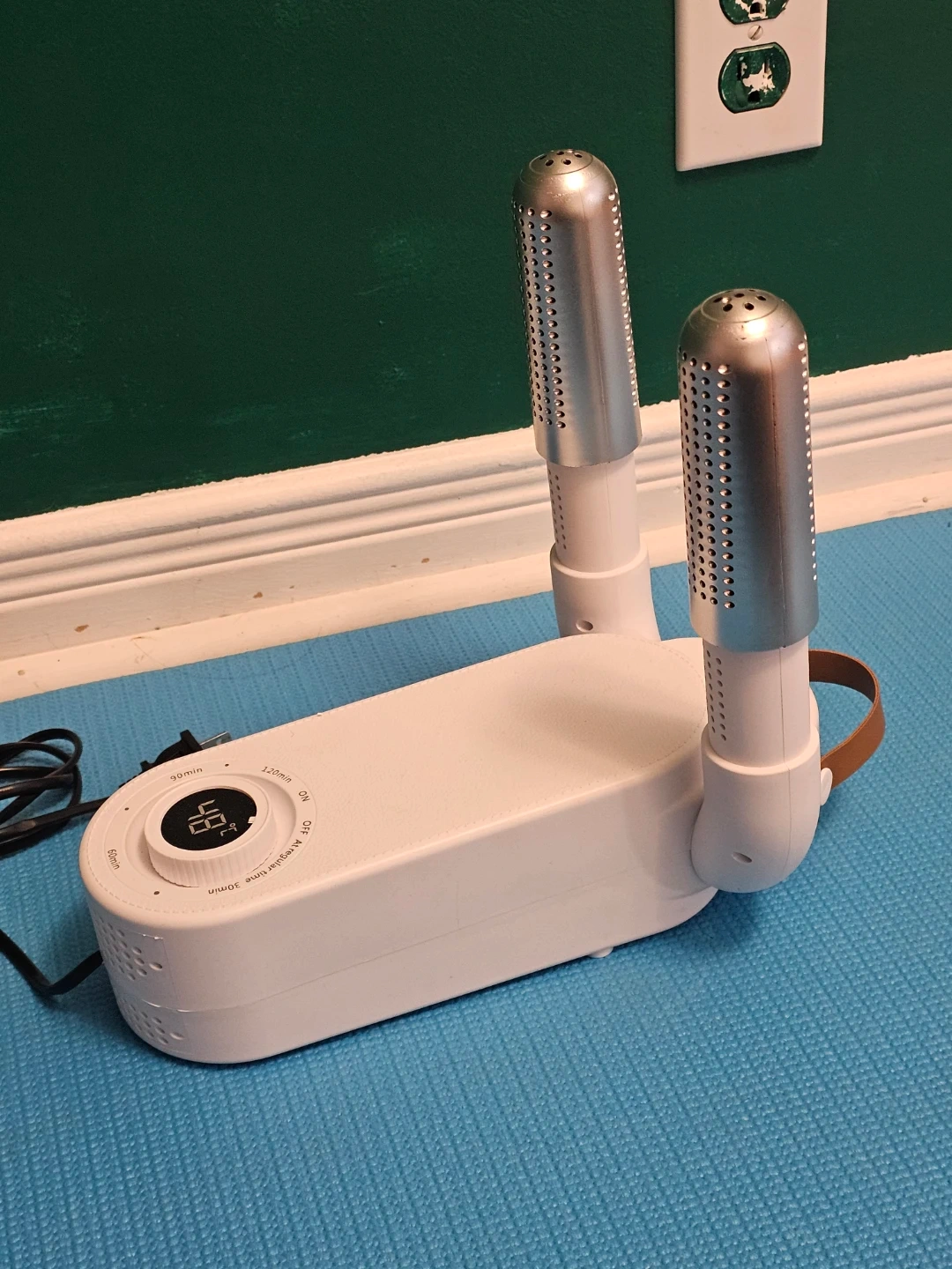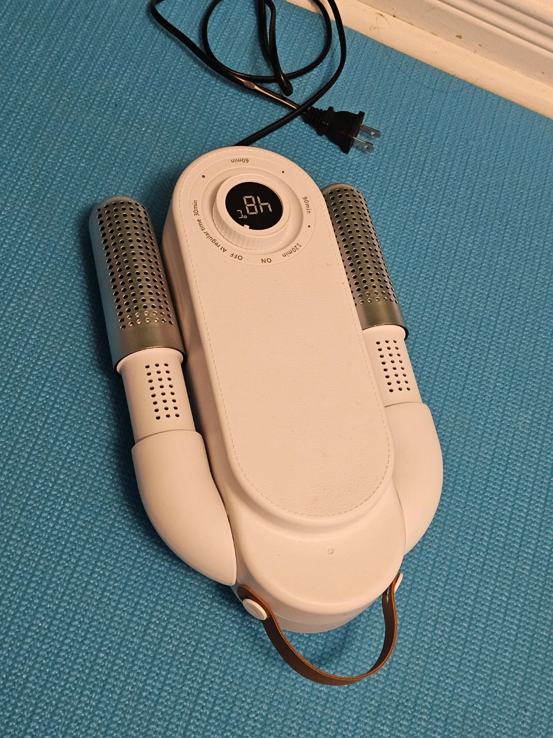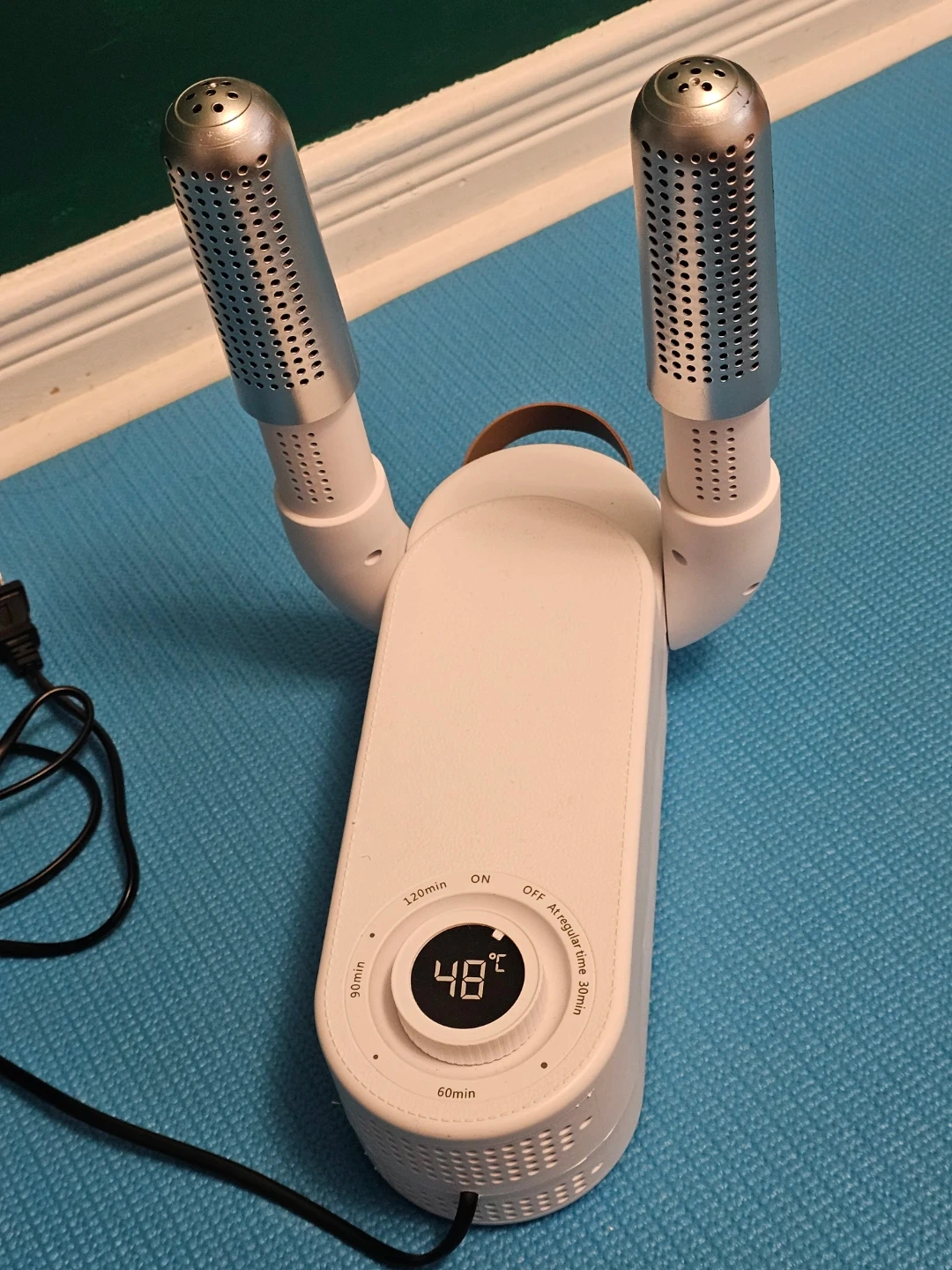 This white shoe dryer helps to dry your footwear quickly. It has a timer with settings for 30, 60, 90, and 120 minutes. The unit displays the temperature at 48°C. It's useful for damp or sweaty shoes.