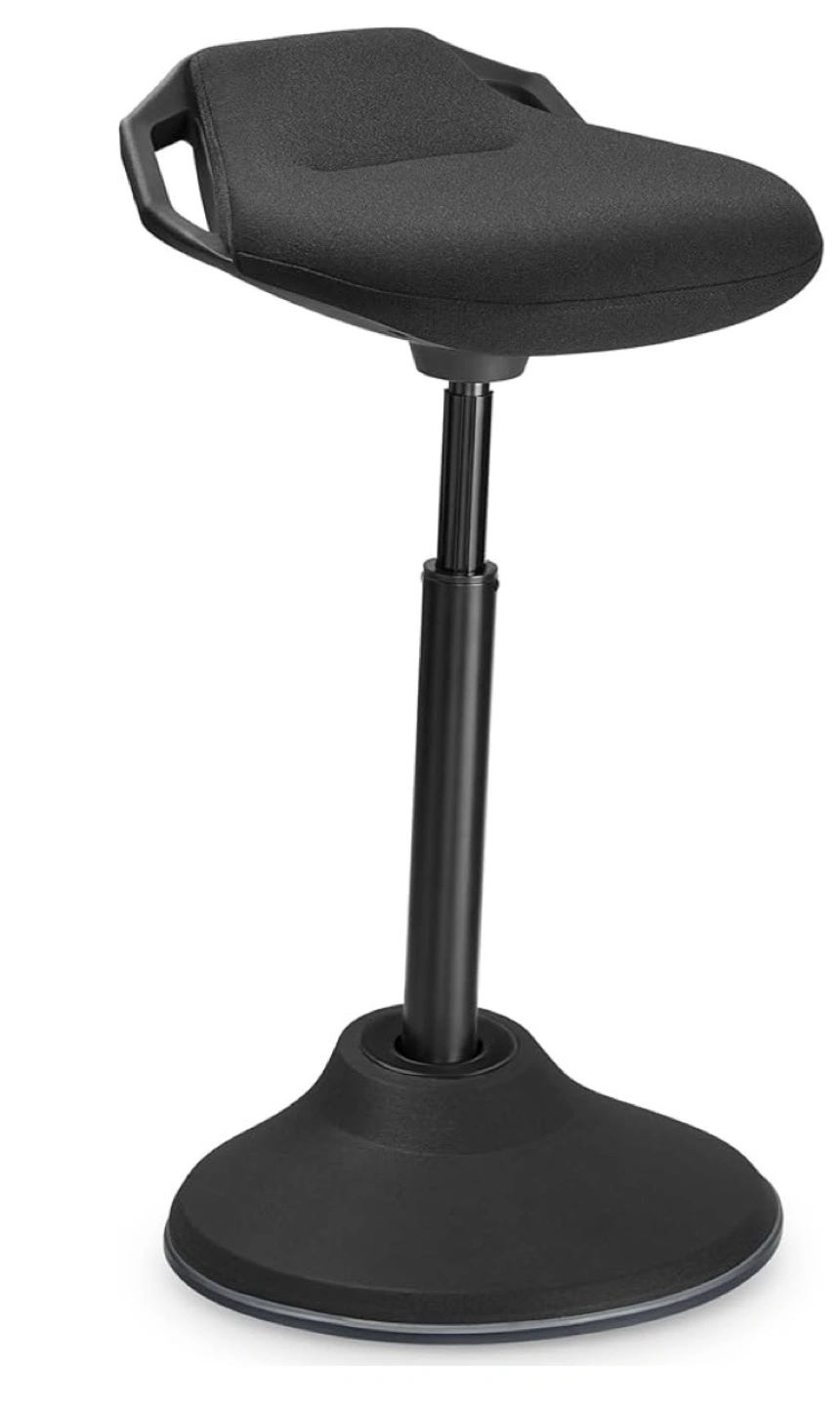 Black kneeling stool. Features height adjustment, handles for mobility, and a large anti-slip base. Maximum weight capacity 264 lb. Suitable for users 59.4"-75.6" tall.