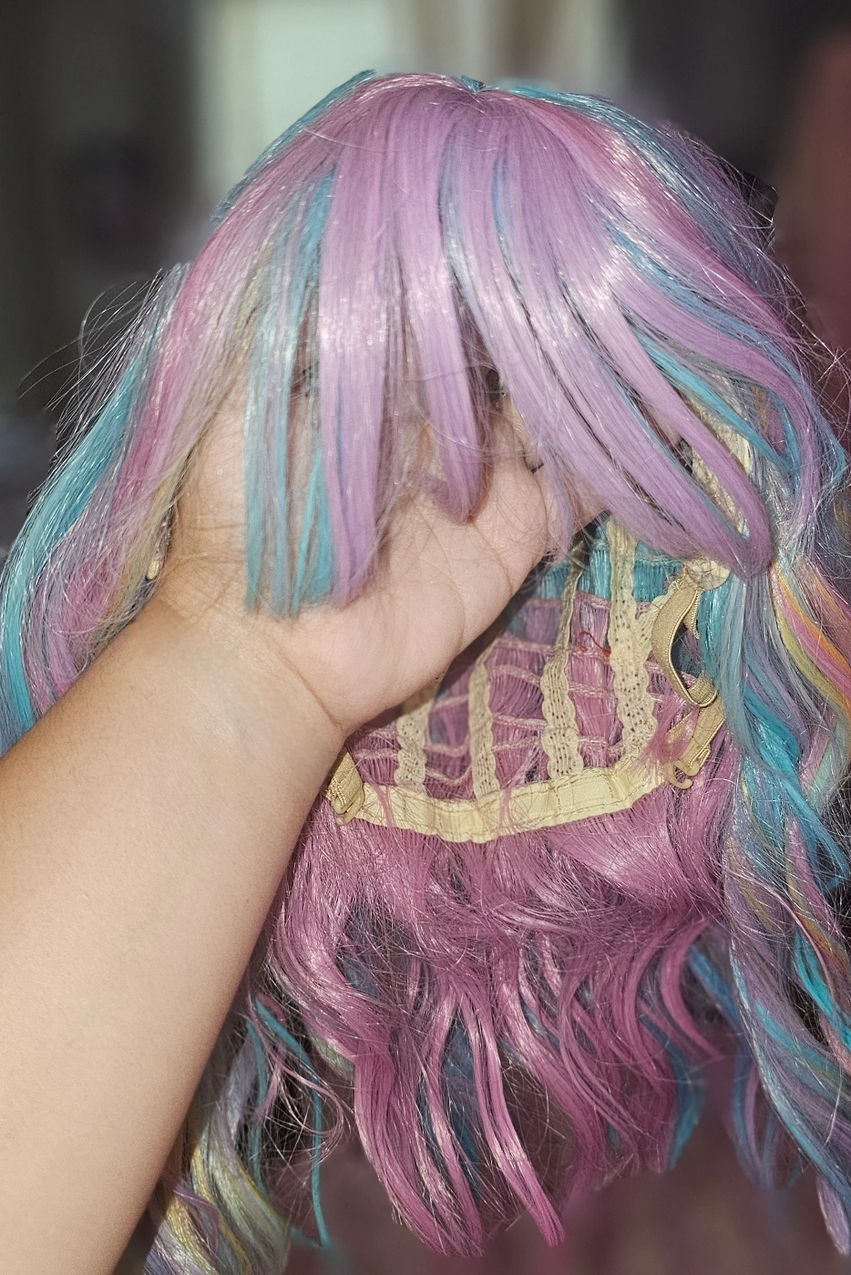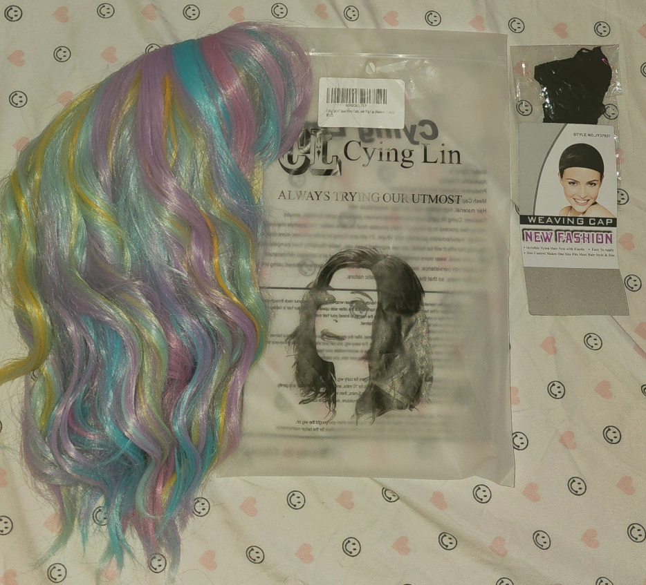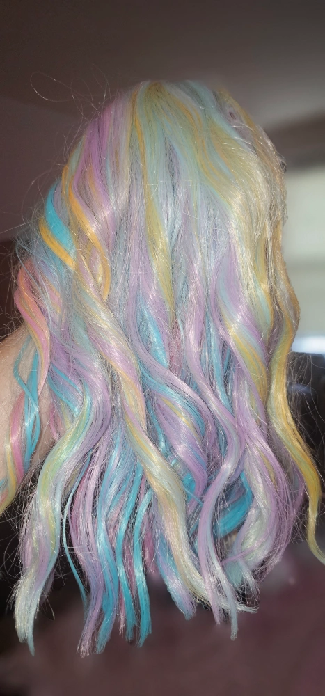 Selling a fun and vibrant Cying Lin colorful wig! It comes with a weaving cap to help keep everything in place. The wig features a mix of pastel colors, perfect for adding a pop of color to your look. Ready for a new home!