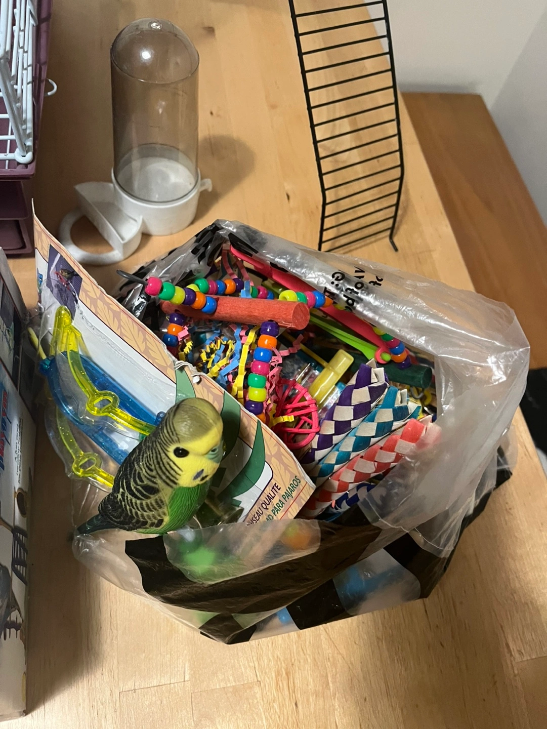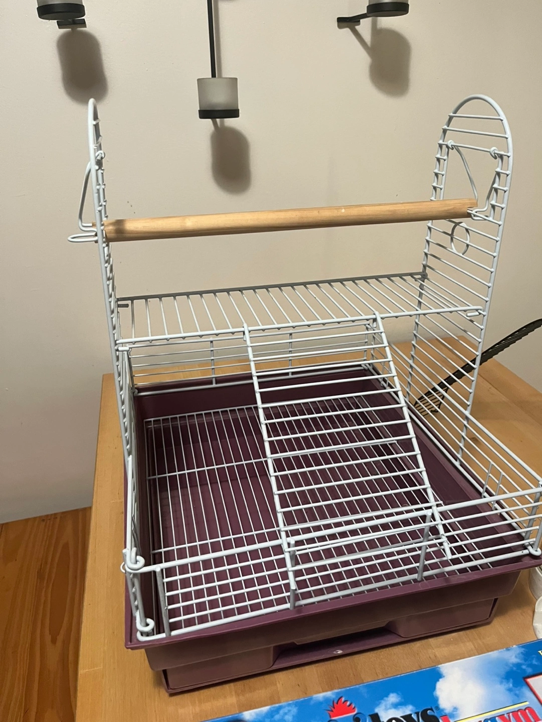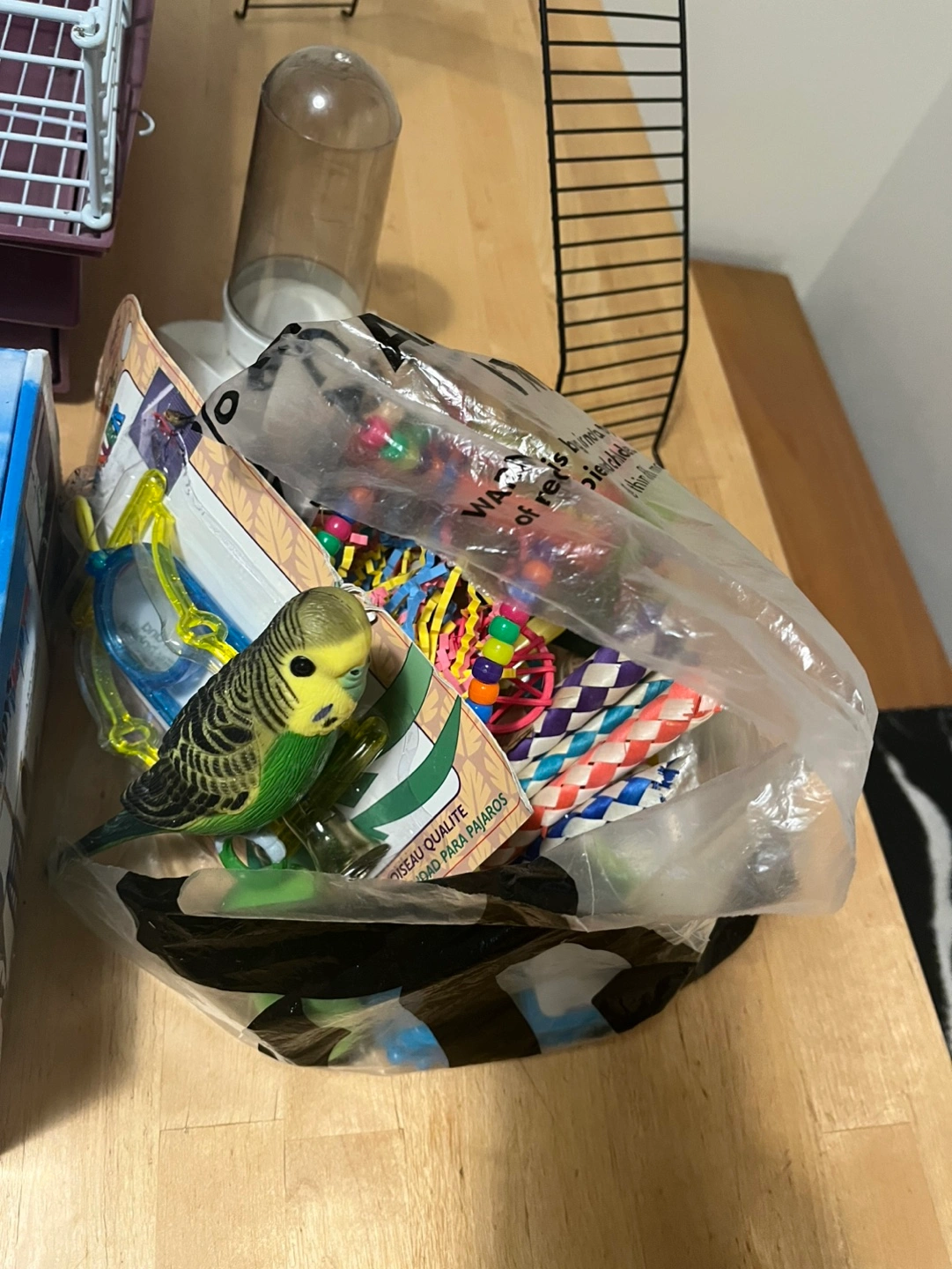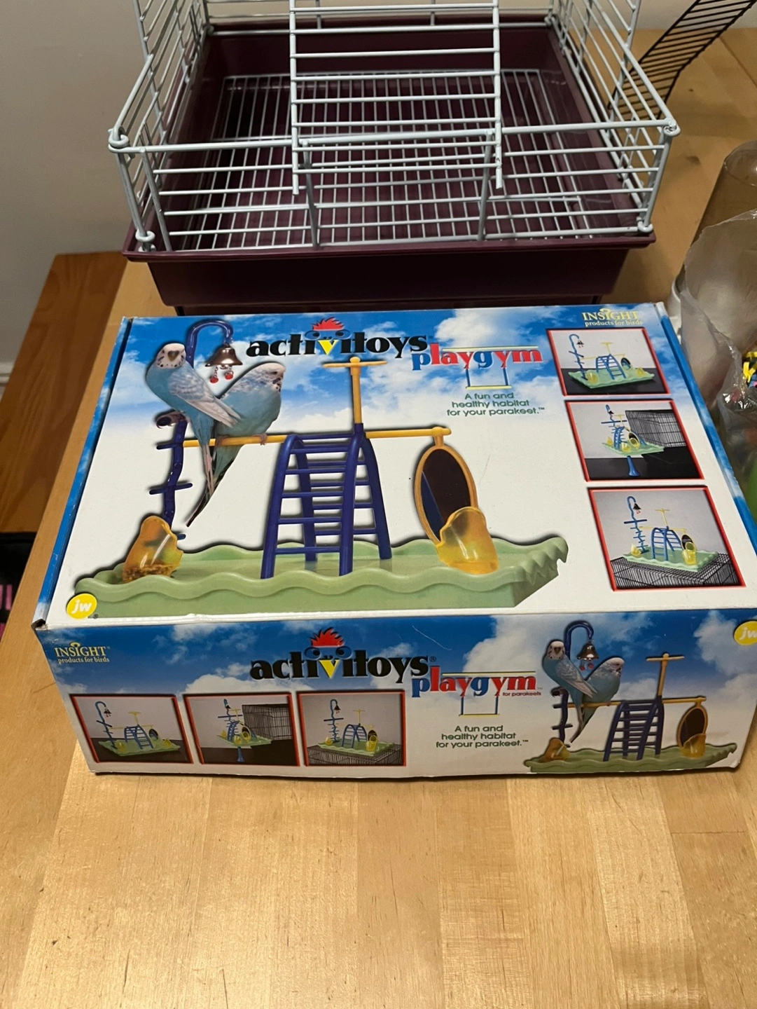 Free bird supplies - 1) Metal gym/play area with a pull-out tray for time outside the cage. 2) Plastic play gym comes with a perch and a set of toys. 3) Black metal ladder that can be placed on top or on the side of cage for playtime. 4) Additional miscellaneous toys (mirror, swing, shredding) and small feeder.