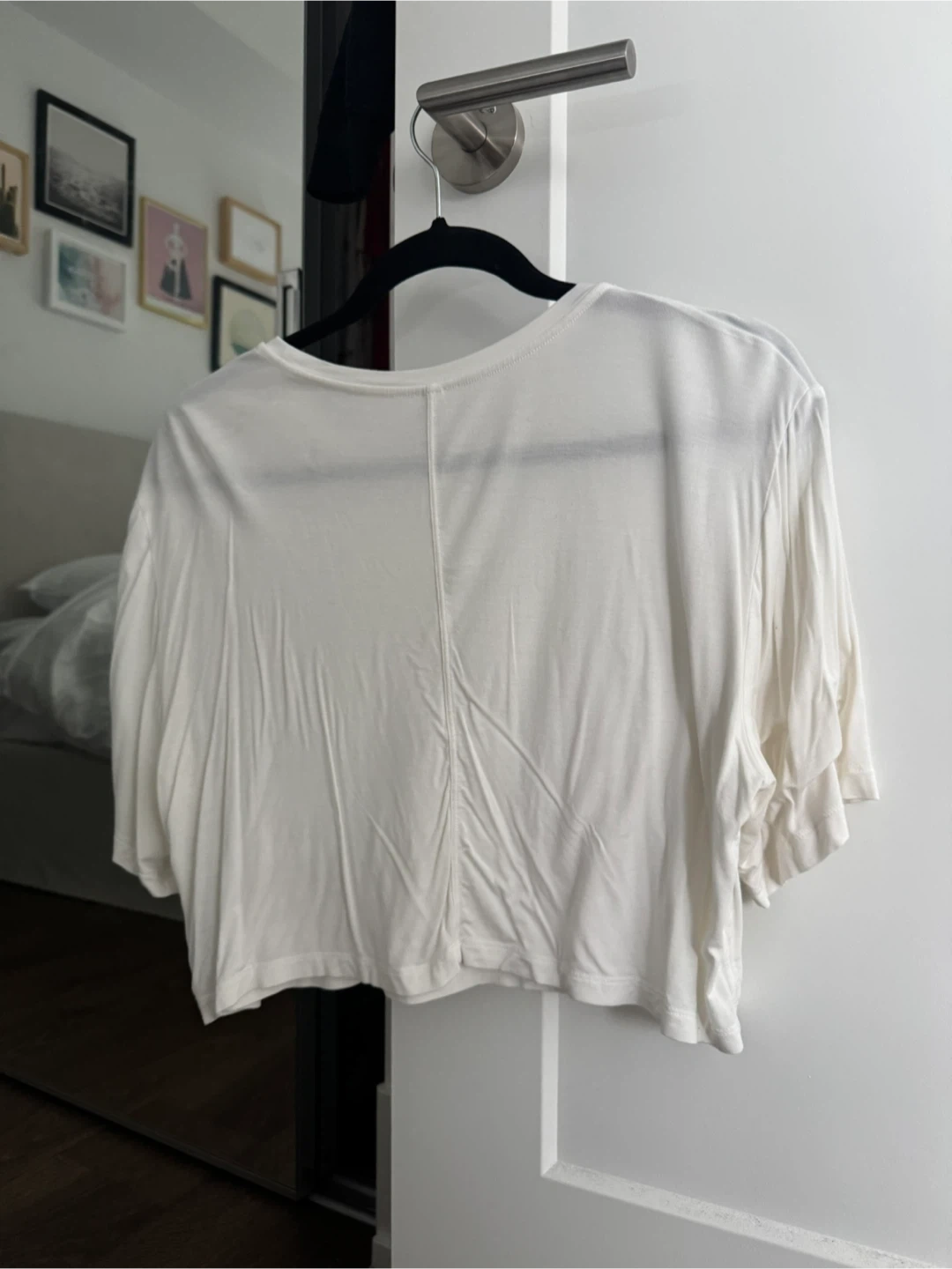 Soft white cropped t-shirt. It's made from a lightweight, breathable fabric. Crew neck with short sleeves.