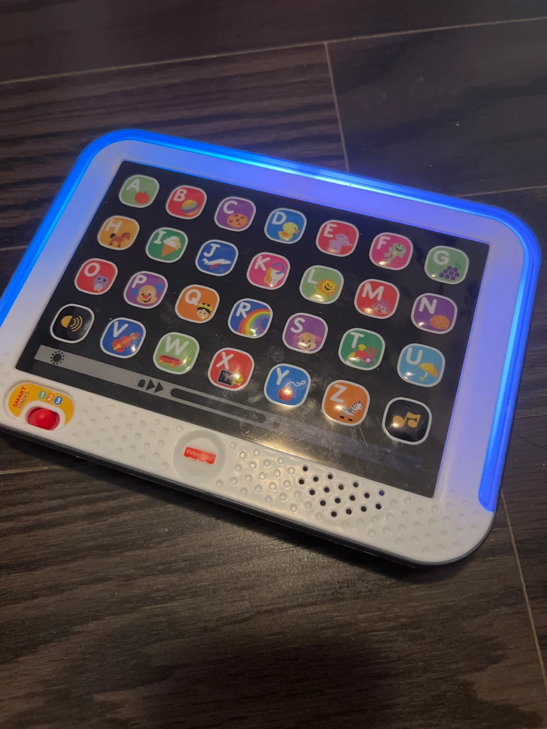 This Fisher-Price Smart Stages tablet is a fun learning toy. It lights up with blue accents and plays sounds. It's designed for early learning with letter and picture buttons.