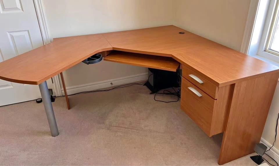 Upgrade your home office with this sturdy, L-shaped corner desk. It offers a massive amount of surface area, perfect for a dual-monitor setup, gaming, or crafting. Features: Built-in two-drawer filing cabinet with sleek silver handles, a circular cable management grommet, and a stylish curved "peninsula" end with a modern silver support leg. Condition: Well-maintained with a clean wood-grain finish. Note: Keyboard tray is not included. Dimensions: 70cm height, 150cm wide each side (without the angled part on the left), 50cm depth on the sides, and 1m depth at the corner piece. The desk is disassembled and ready for transport.