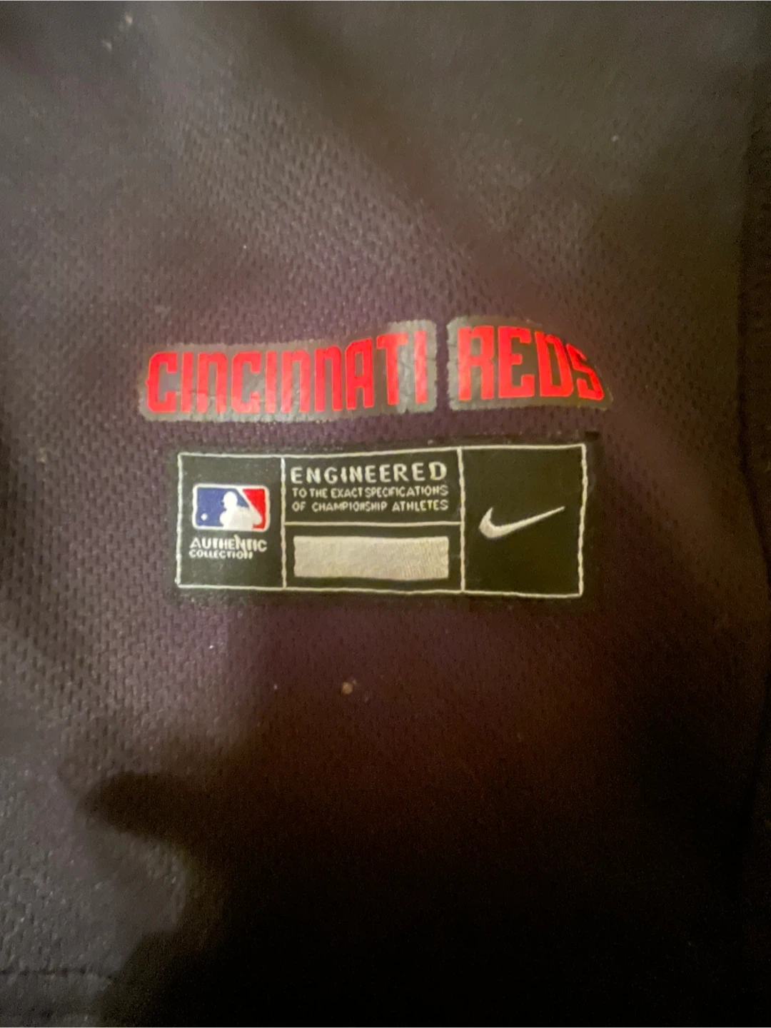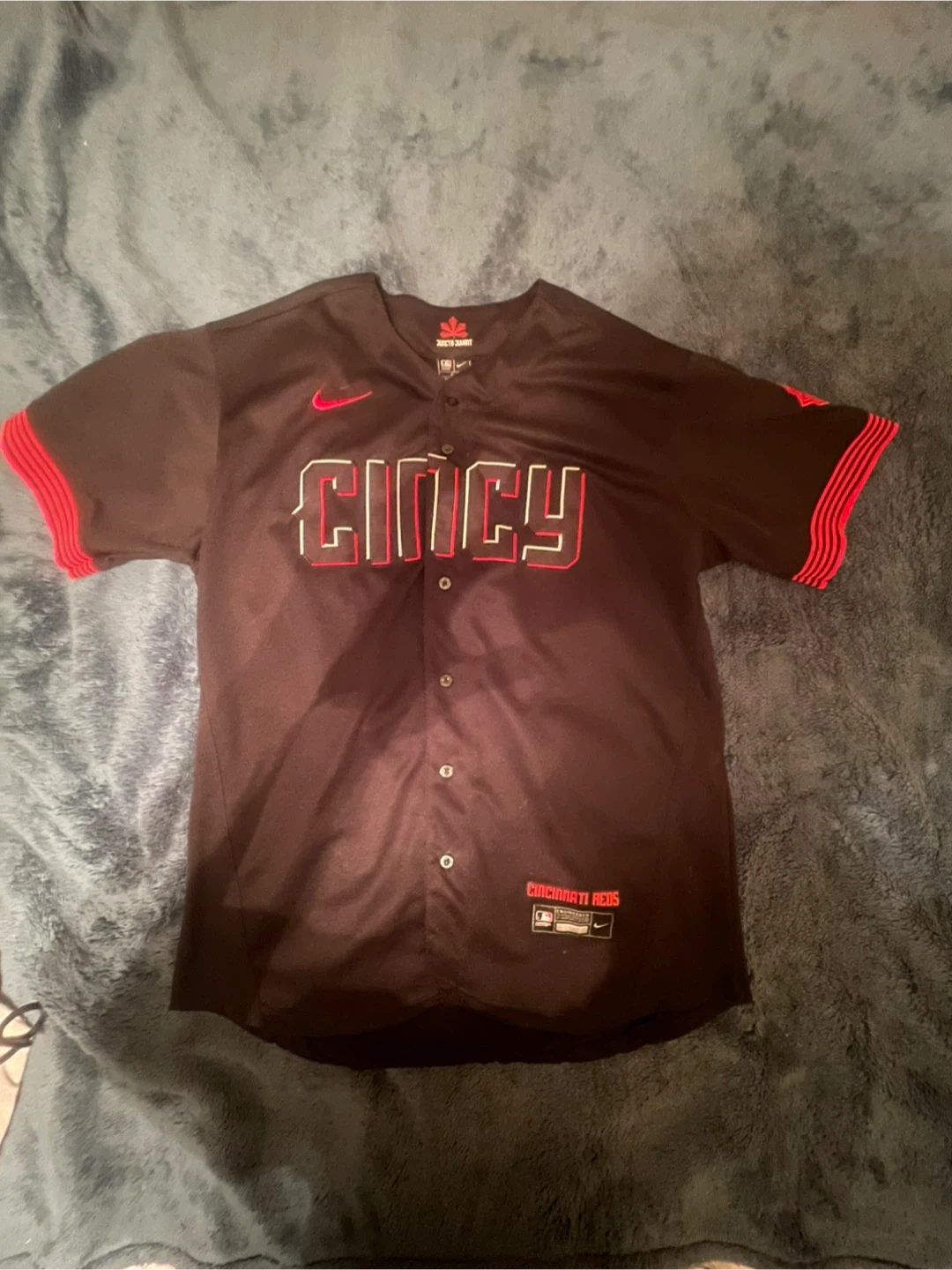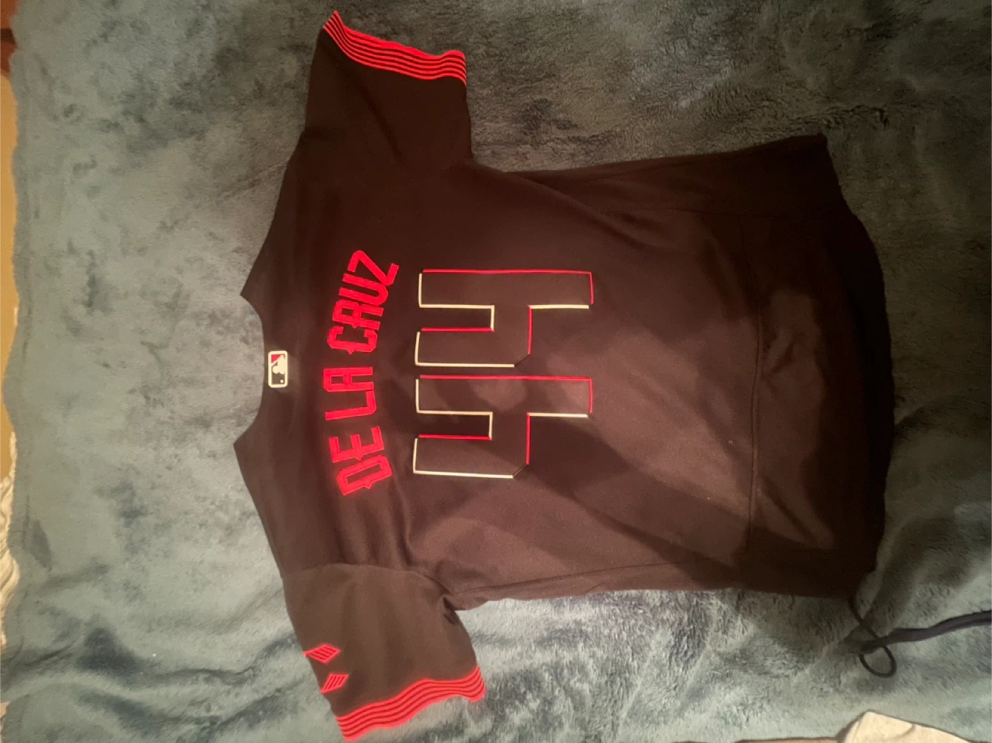 Authentic Cincinnati Reds baseball jersey featuring Elly De La Cruz. It's a size men's large, made by Nike and engineered to exact specifications. This jersey's black and red design is perfect for any fan!