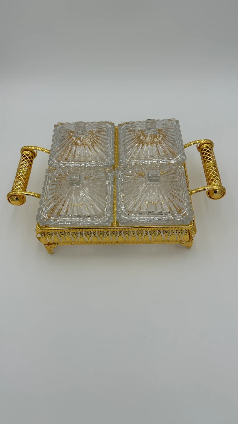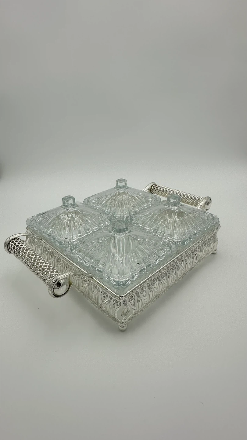 This is a lovely glass candy dish with four individual compartments, each with a lid. It has ornate silver-toned handles and a decorative base. It's perfect for serving sweets or small snacks.