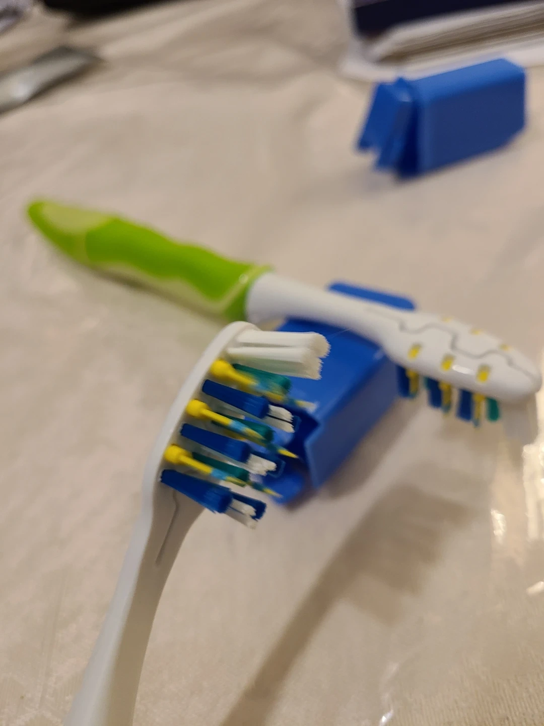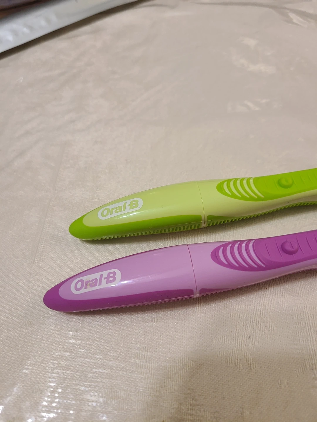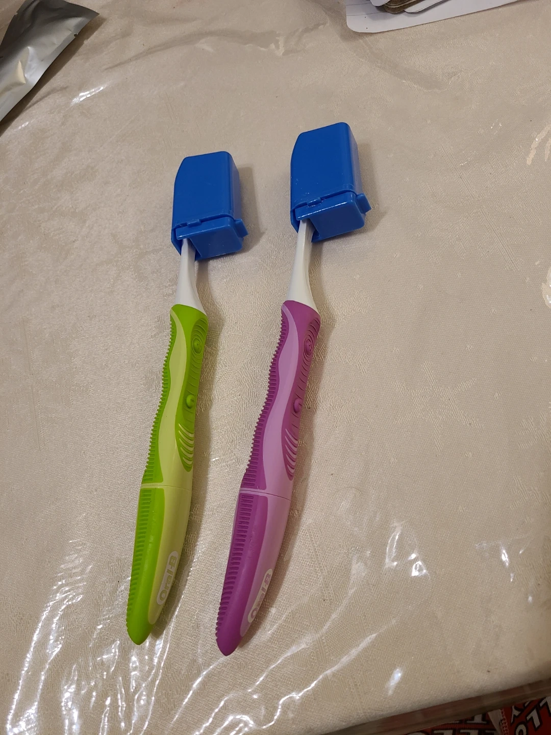 Two Oral-B toothbrushes included, one in green and one in purple. Each toothbrush comes with a blue protective cap. Necer used.They're great for everyday oral hygiene.