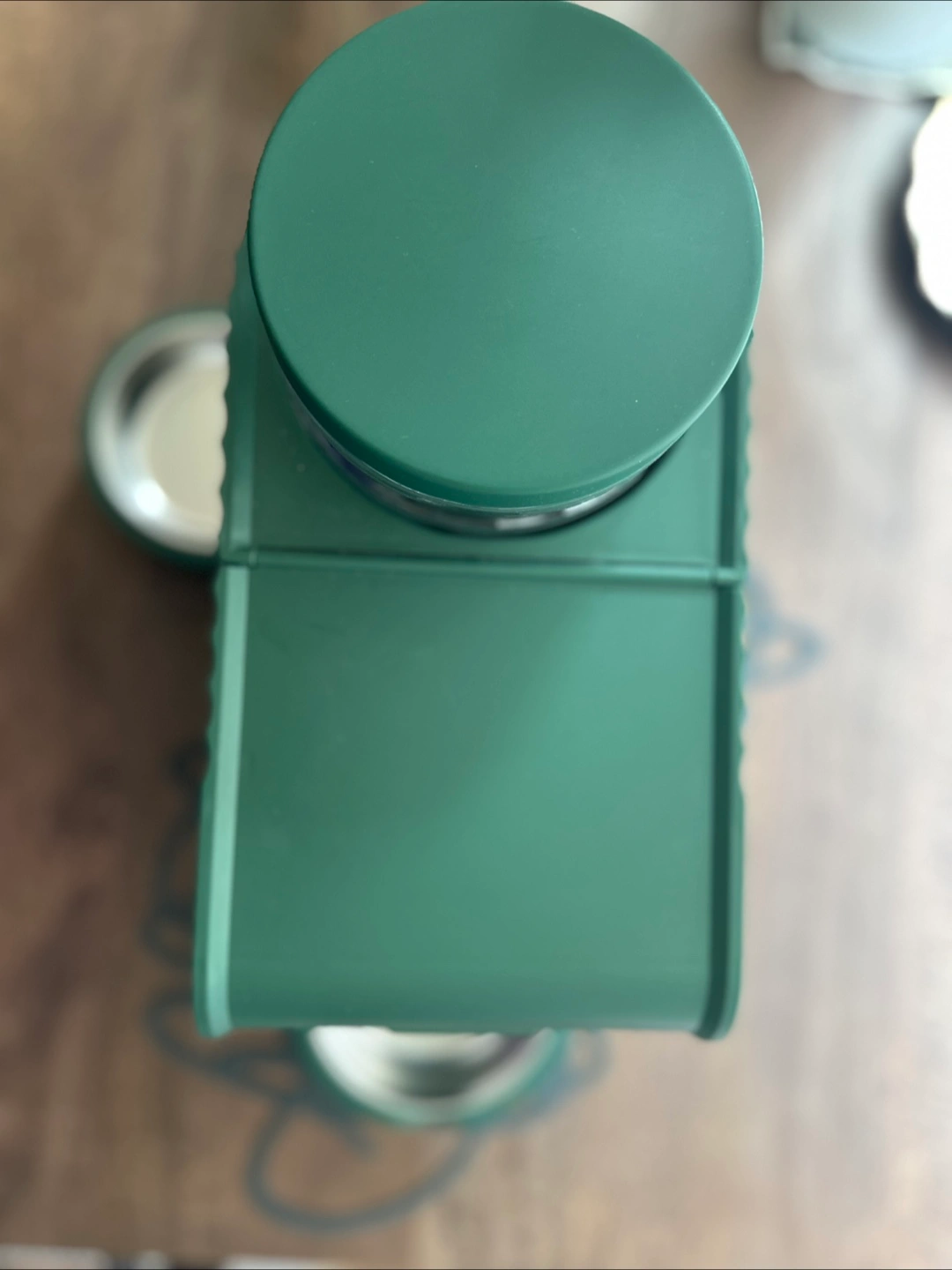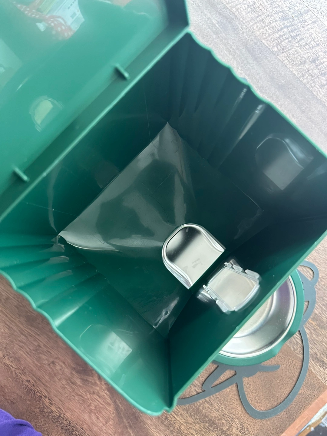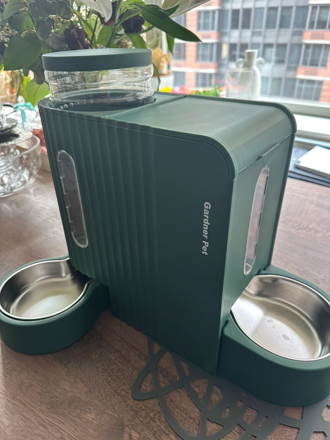 An automatic pet feeder, great for busy pet owners. Dark green in color. Includes two stainless steel bowls. One side features a clear container.