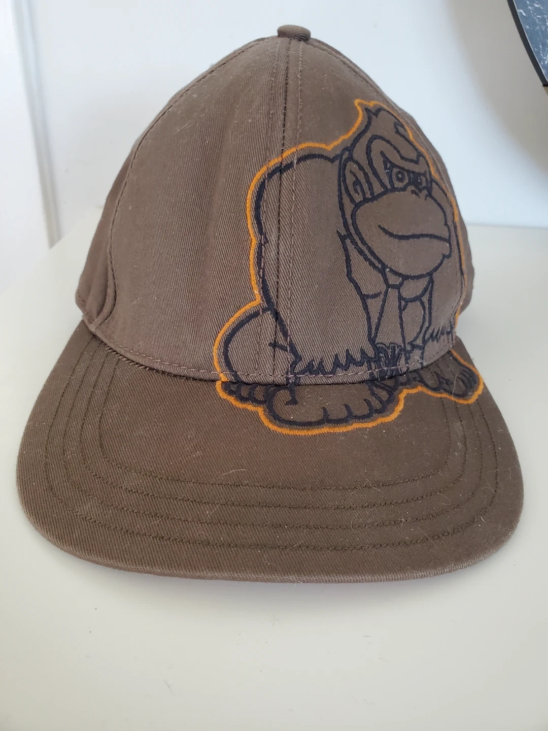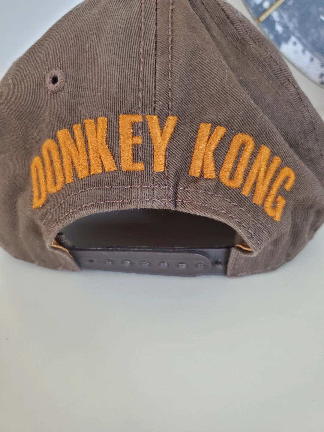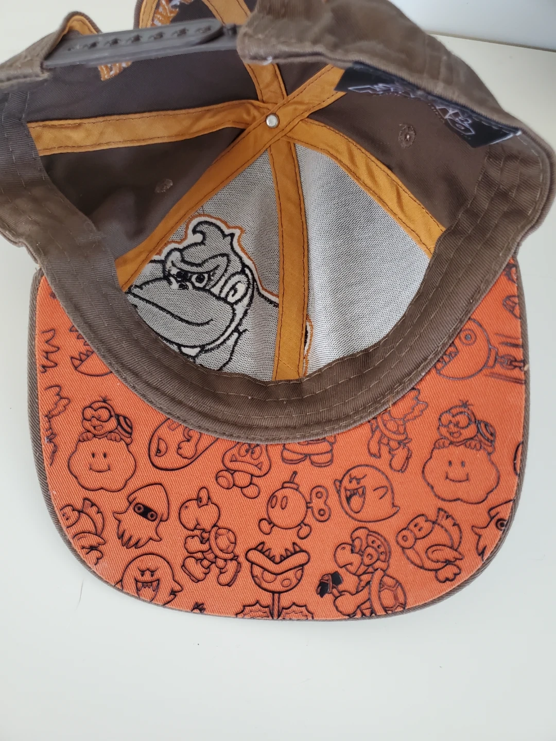 Brown baseball cap with Donkey Kong and Mario characters. Features adjustable strap for a comfy fit. It's a fun cap for any Nintendo fan!