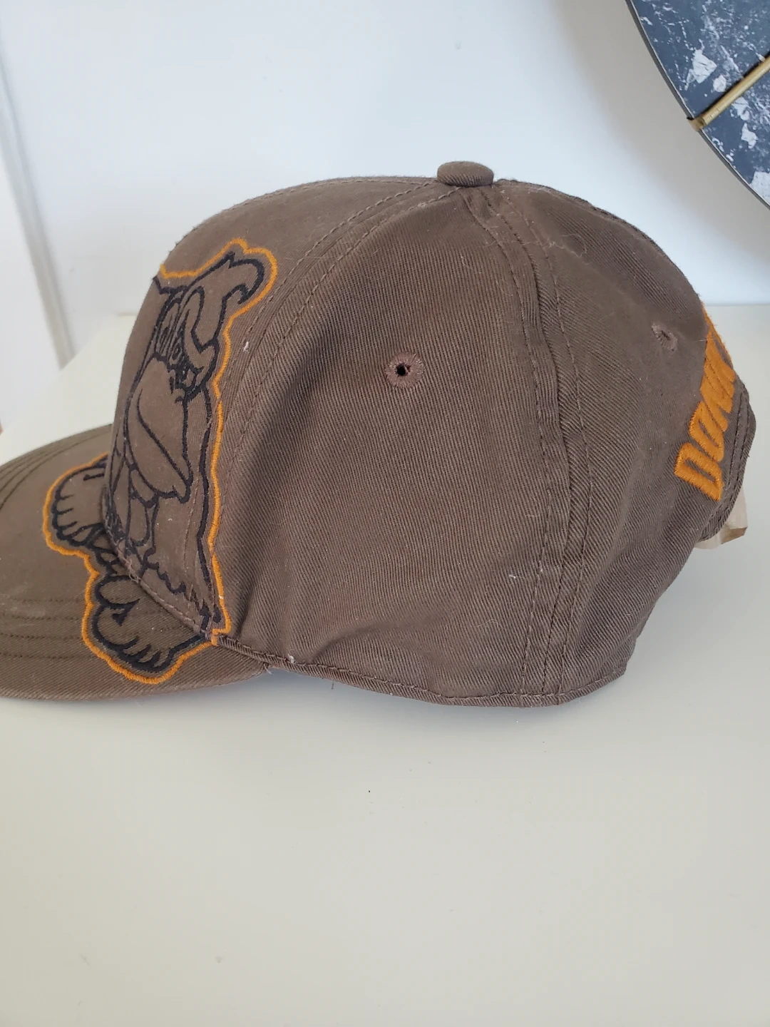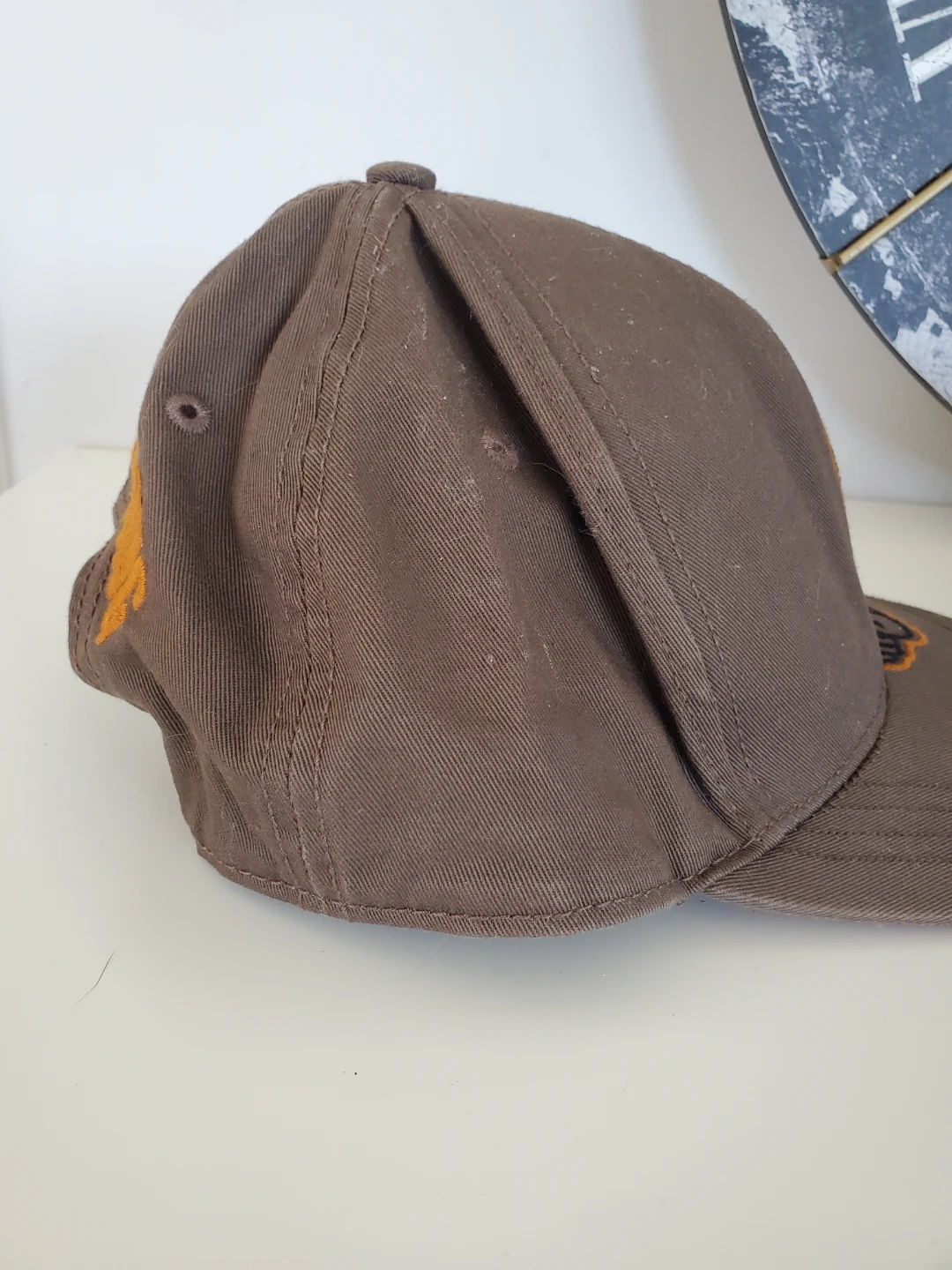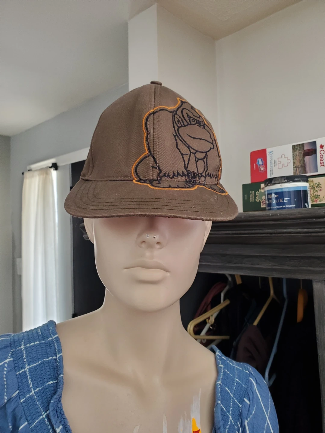 Brown baseball cap with Donkey Kong and Mario characters. Features adjustable strap for a comfy fit. It's a fun cap for any Nintendo fan!