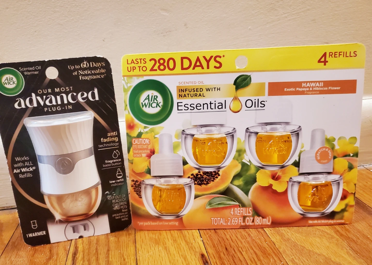 Selling an Air Wick scented oil warmer with 4 Hawaii Exotic Papaya & Hibiscus Flower refills! The warmer is the advanced plug-in model, which works with all Air Wick refills. Enjoy up to 280 days of fragrance with the refills included. The warmer also has anti-fading technology and a fragrance boost button!