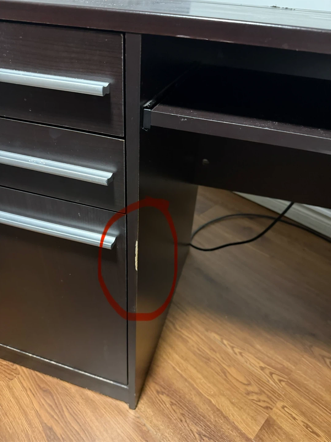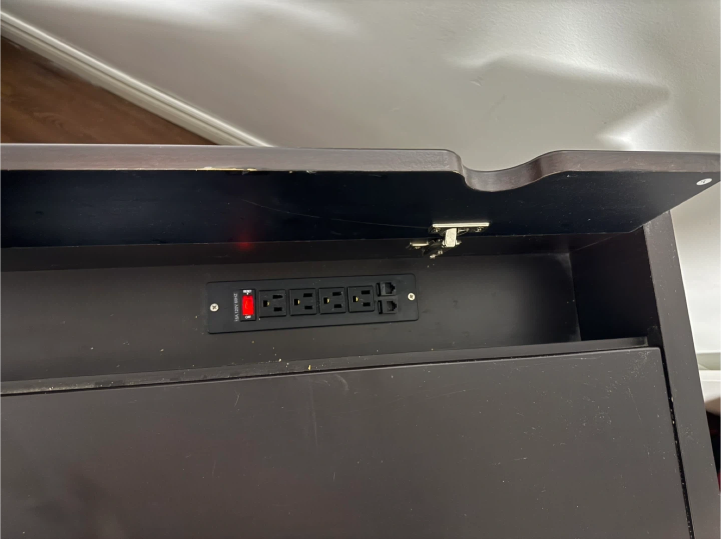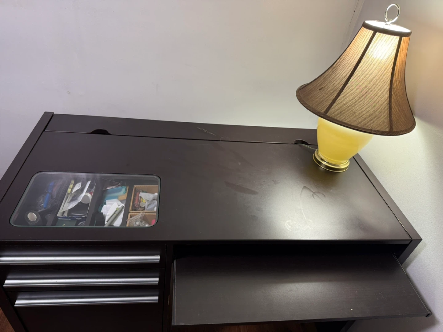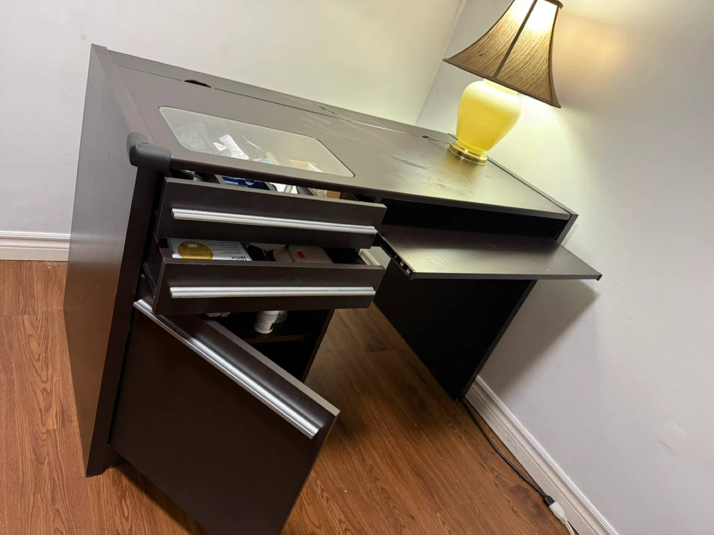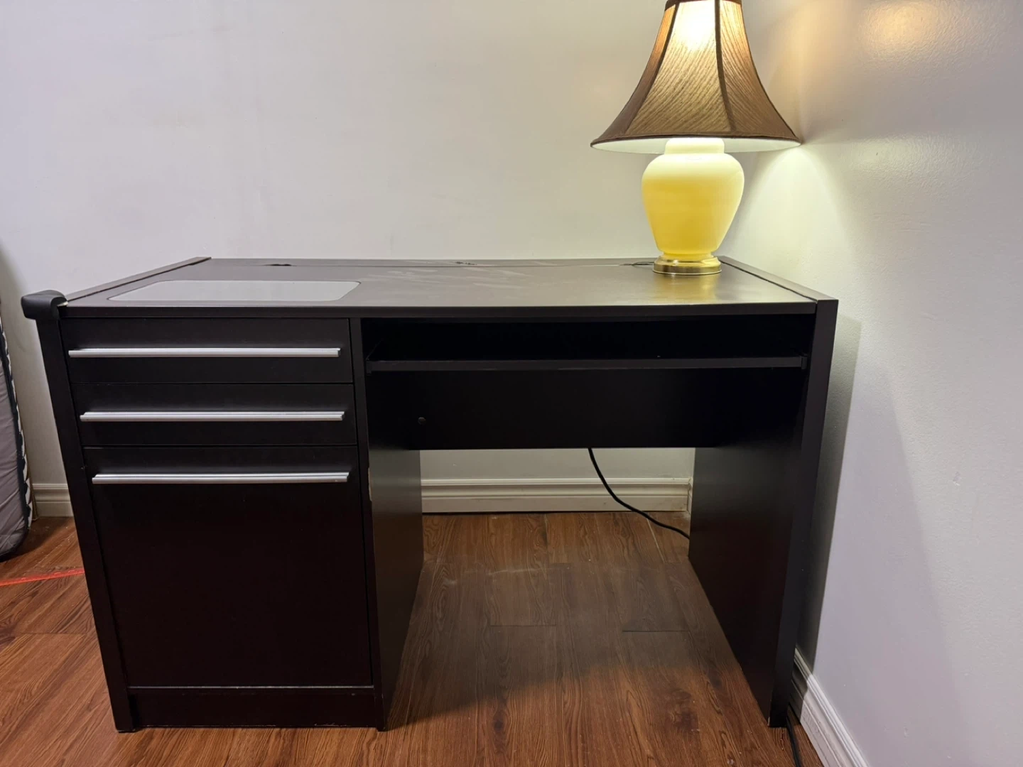 Selling a dark brown desk that's perfect for a home office or study space! It features a built-in power outlet, which is super convenient for charging devices and plugging in lamps. It also has drawers and a keyboard tray for storage and organization