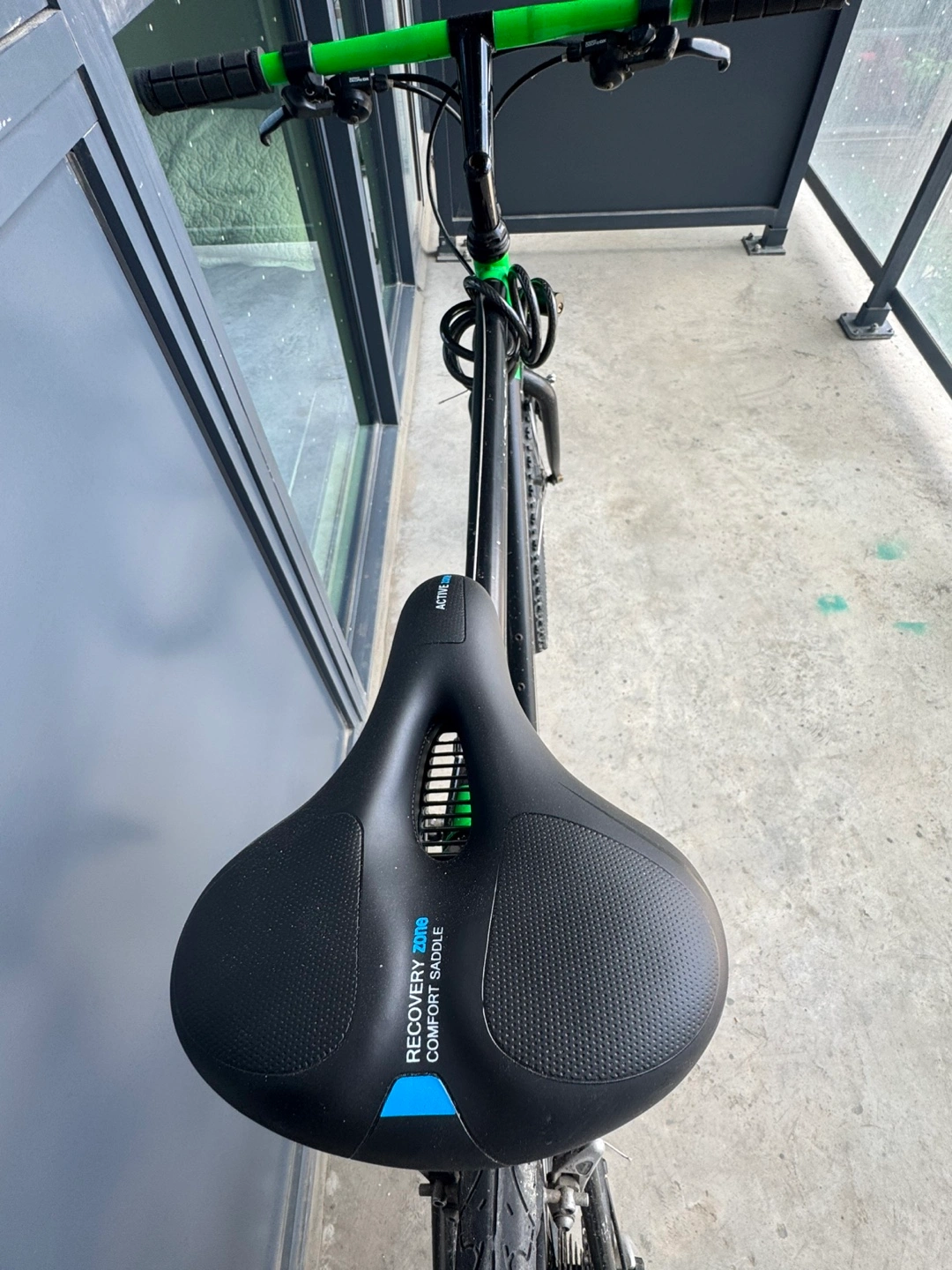 A black bike with green accents. Features two wheels, a seat, and handlebars. It's a great form of exercise to enjoy on a beautiful day.