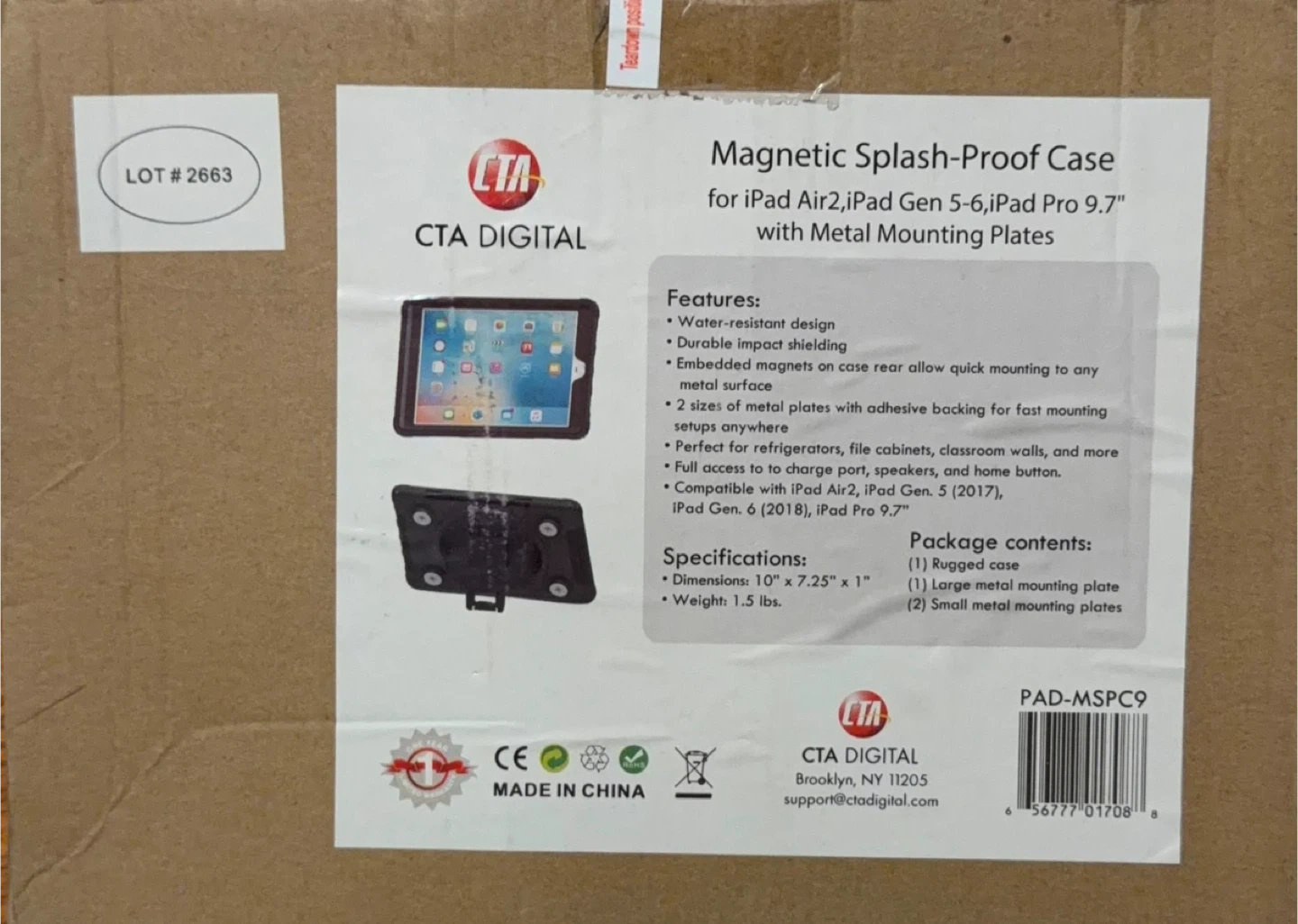 This CTA Digital case is magnetic and splash-proof for iPad Air 2, iPad Gen 5-6, and iPad Pro 9.7". It offers water-resistant design and durable impact shielding. Dimensions are 10" x 7.25" x 1" and it weighs 1.5 lbs. Package includes the rugged case, one large metal mounting plate, and two small metal mounting plates.