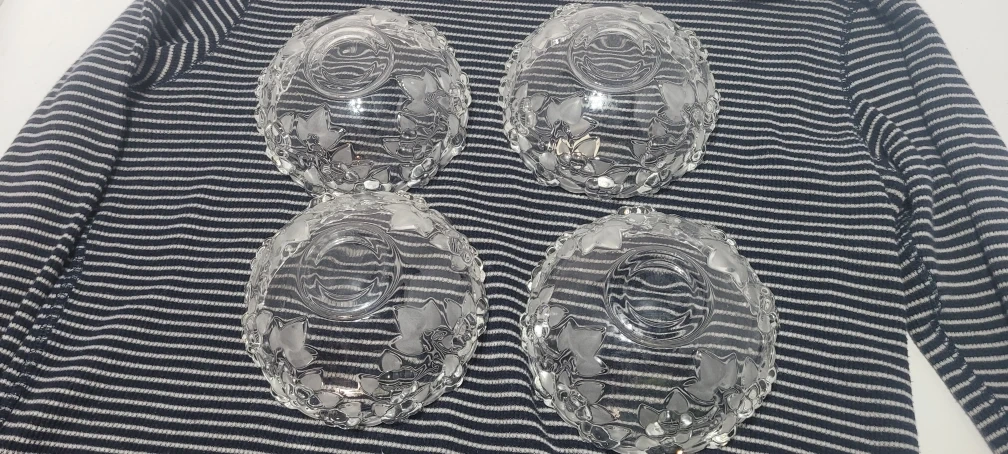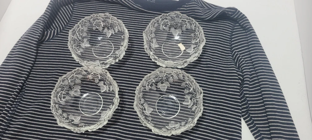 Selling a set of four Mikasa crystal bowls with a beautiful rose pattern. These bowls are perfect for desserts, snacks, or as decorative pieces. They're in great condition and ready to add a touch of elegance to your home