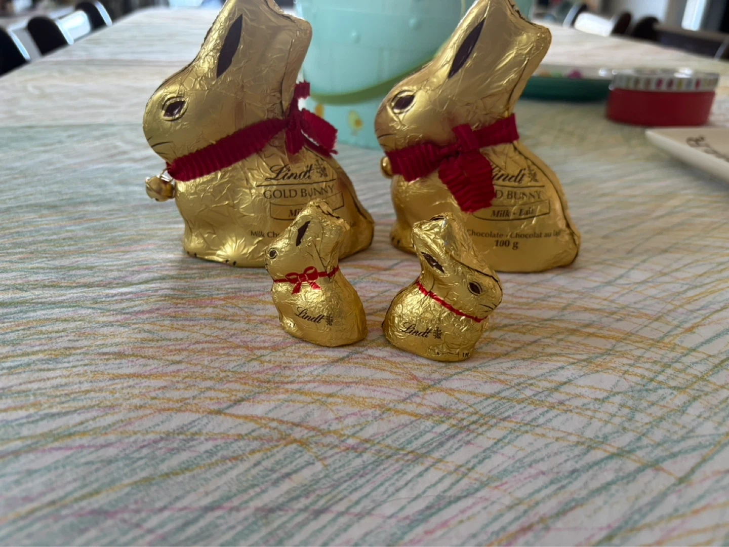 Three Lindt Gold Bunny milk chocolate figures, wrapped in gold foil with red ribbons. Includes two larger bunnies and one small bunny. Each larger bunny is 100g. Perfect for Easter treats!