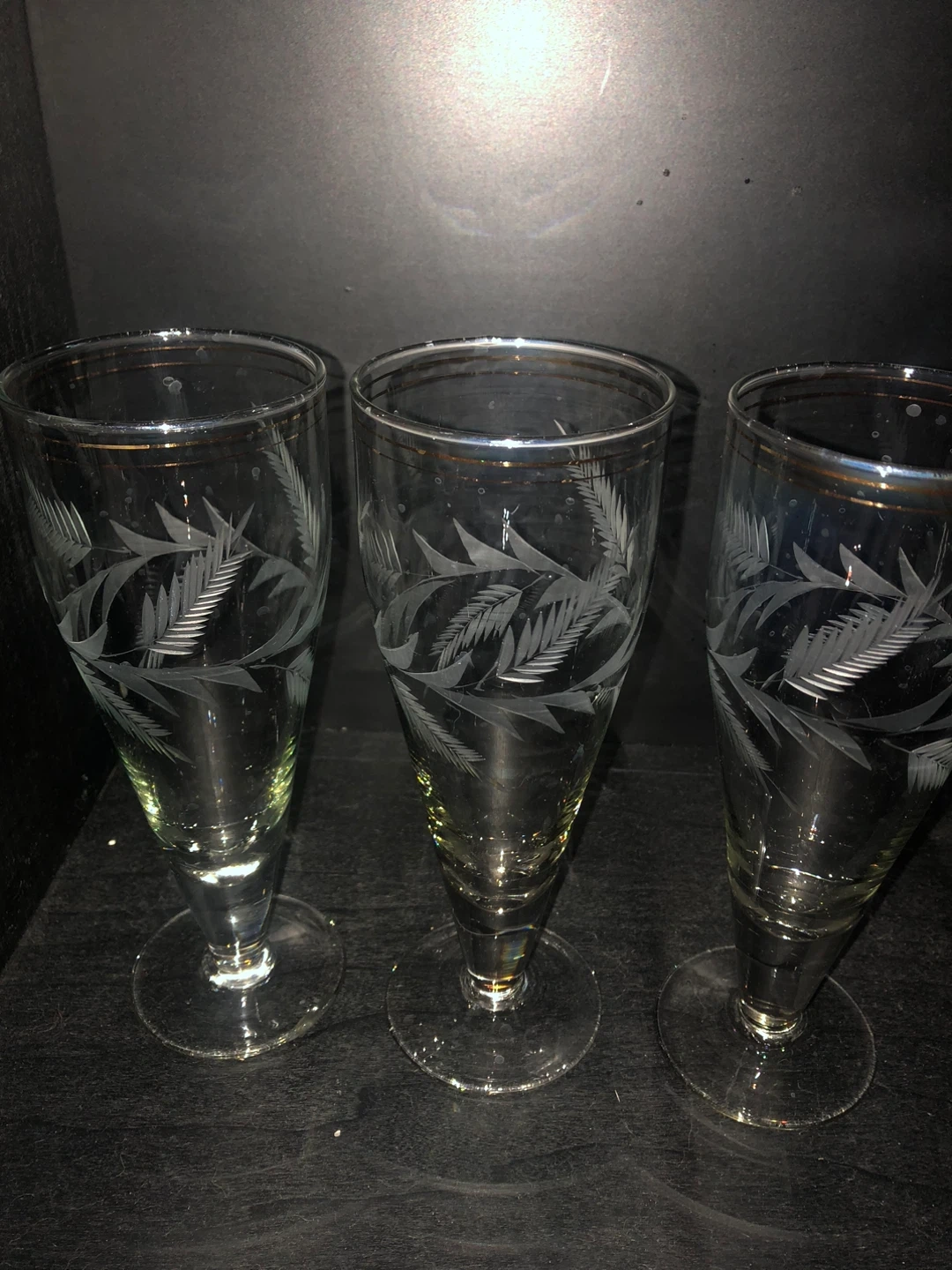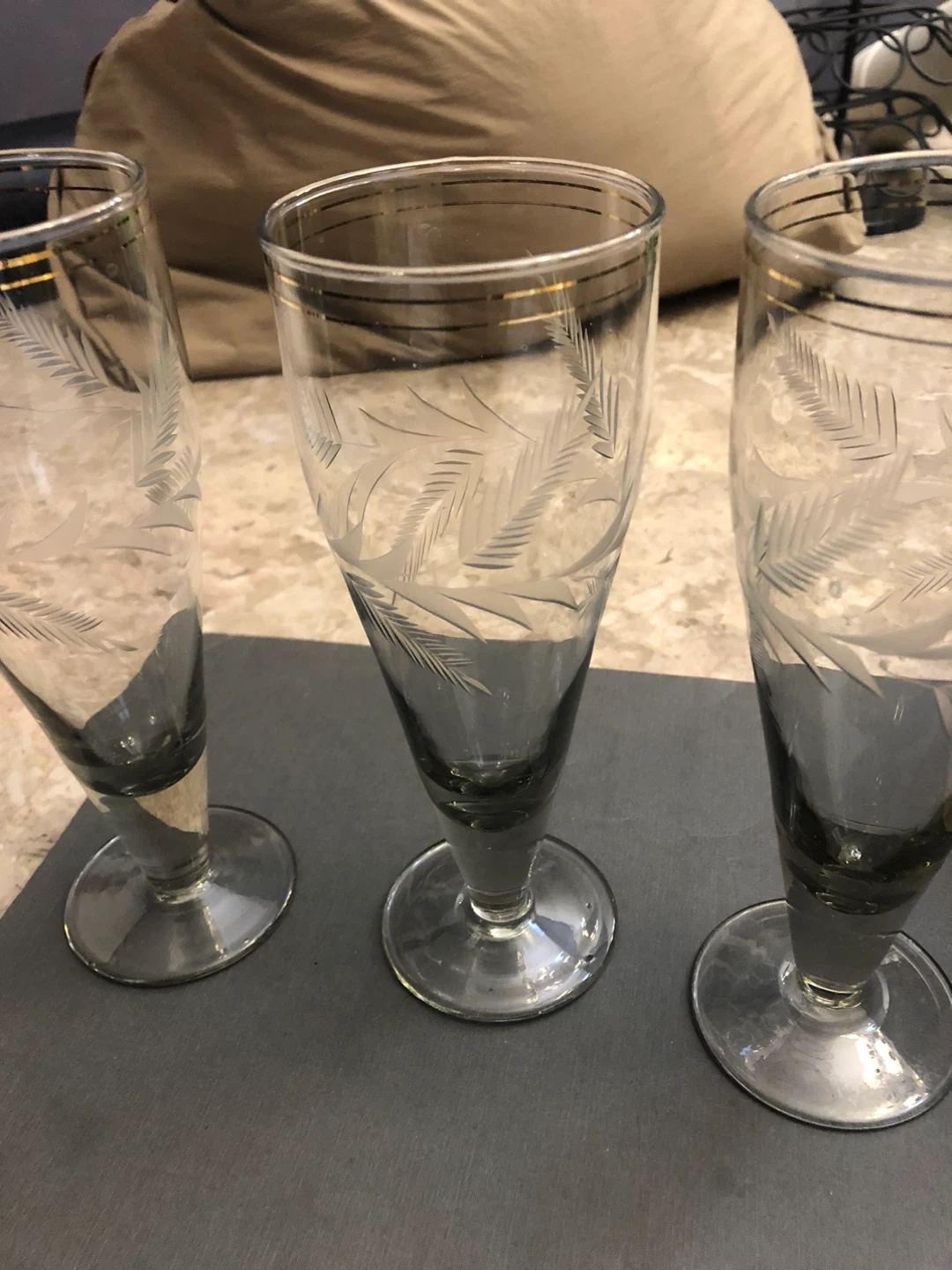 Selling a set of elegant champagne flutes. They feature a delicate etched design and a slender stem, perfect for celebrations or adding a touch of sophistication to your home bar. These glasses are in great condition and ready to elevate your next toast!