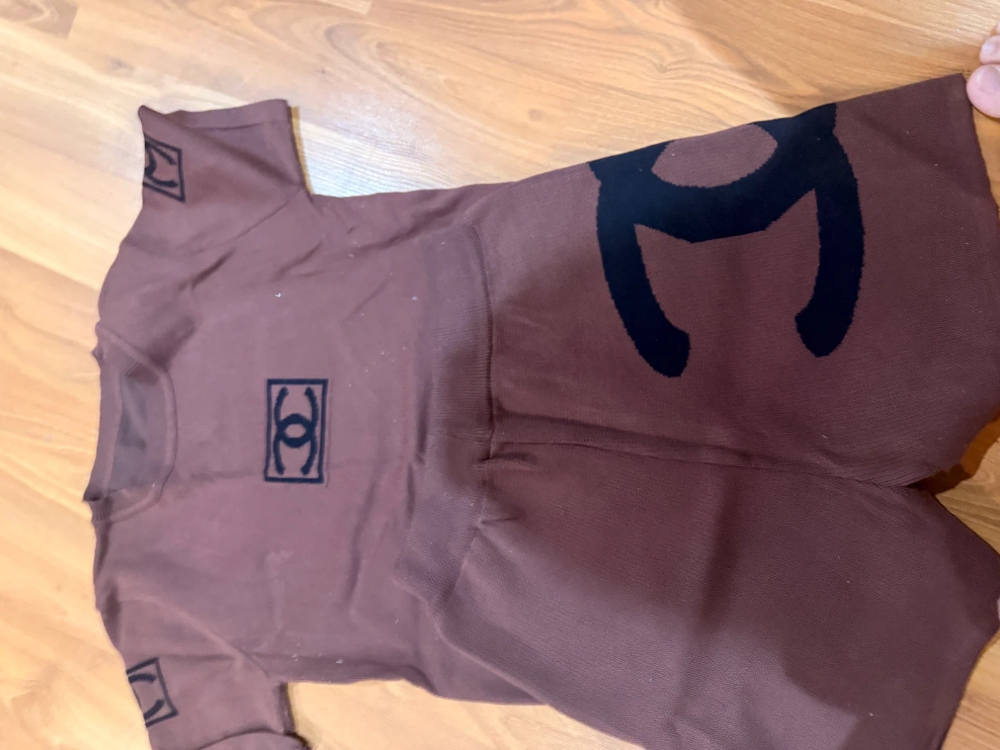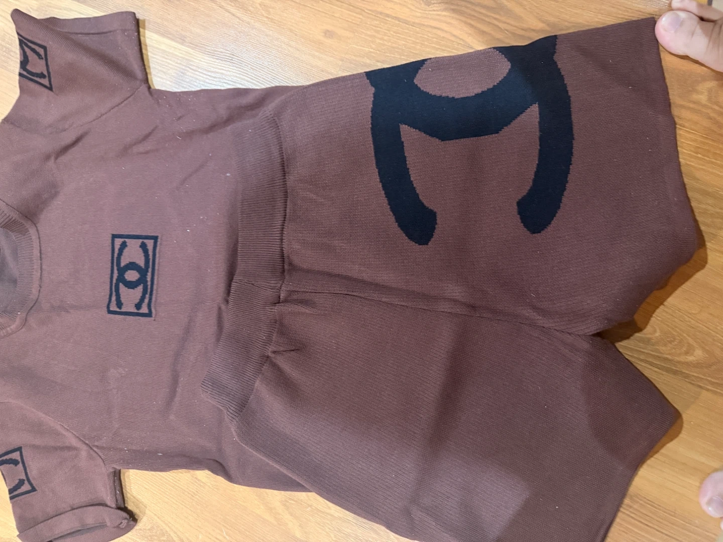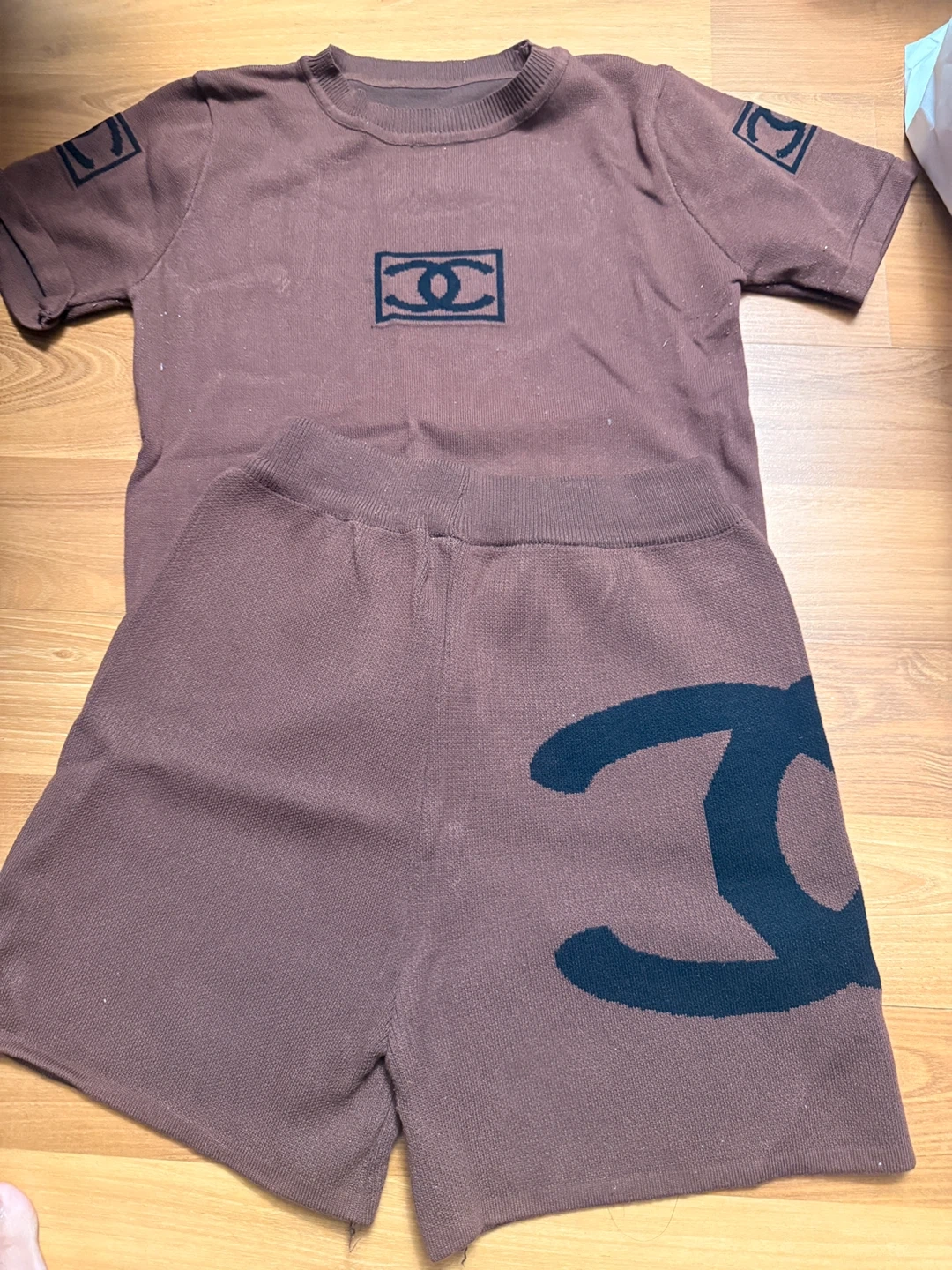 This is a brown knit shorts set. It features the Chanel logo on the shorts and smaller logos on the shirt. Made from a knit material. Size small