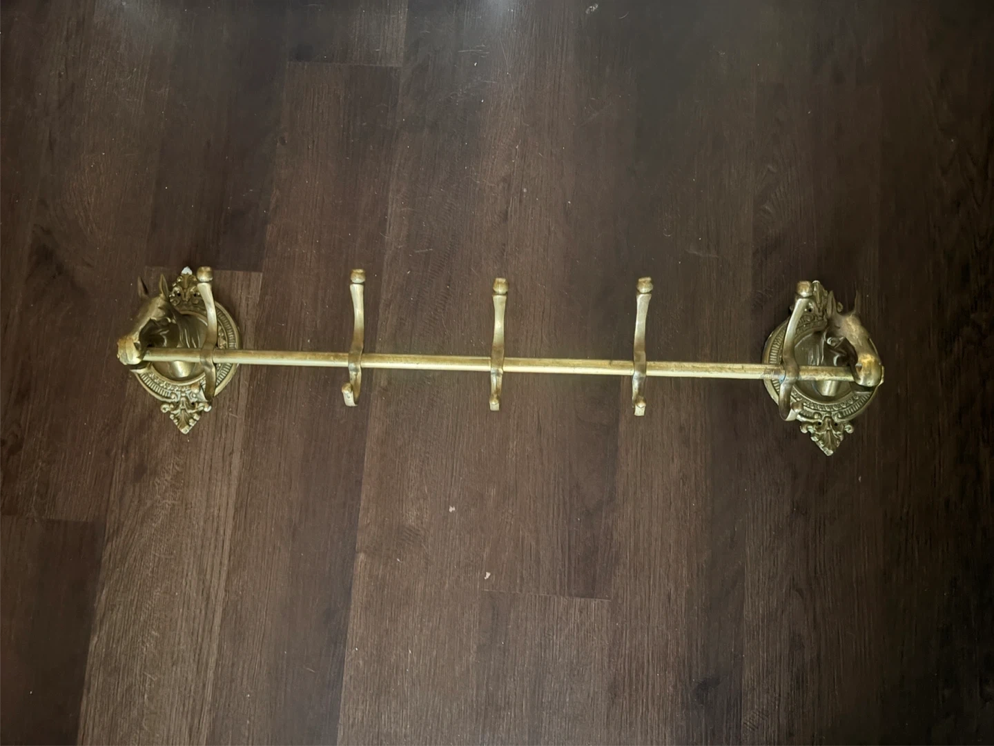 Vintage Brass Double Horse Head Equestrian 5 Hook 39” Coat Hat Bridle Rack.