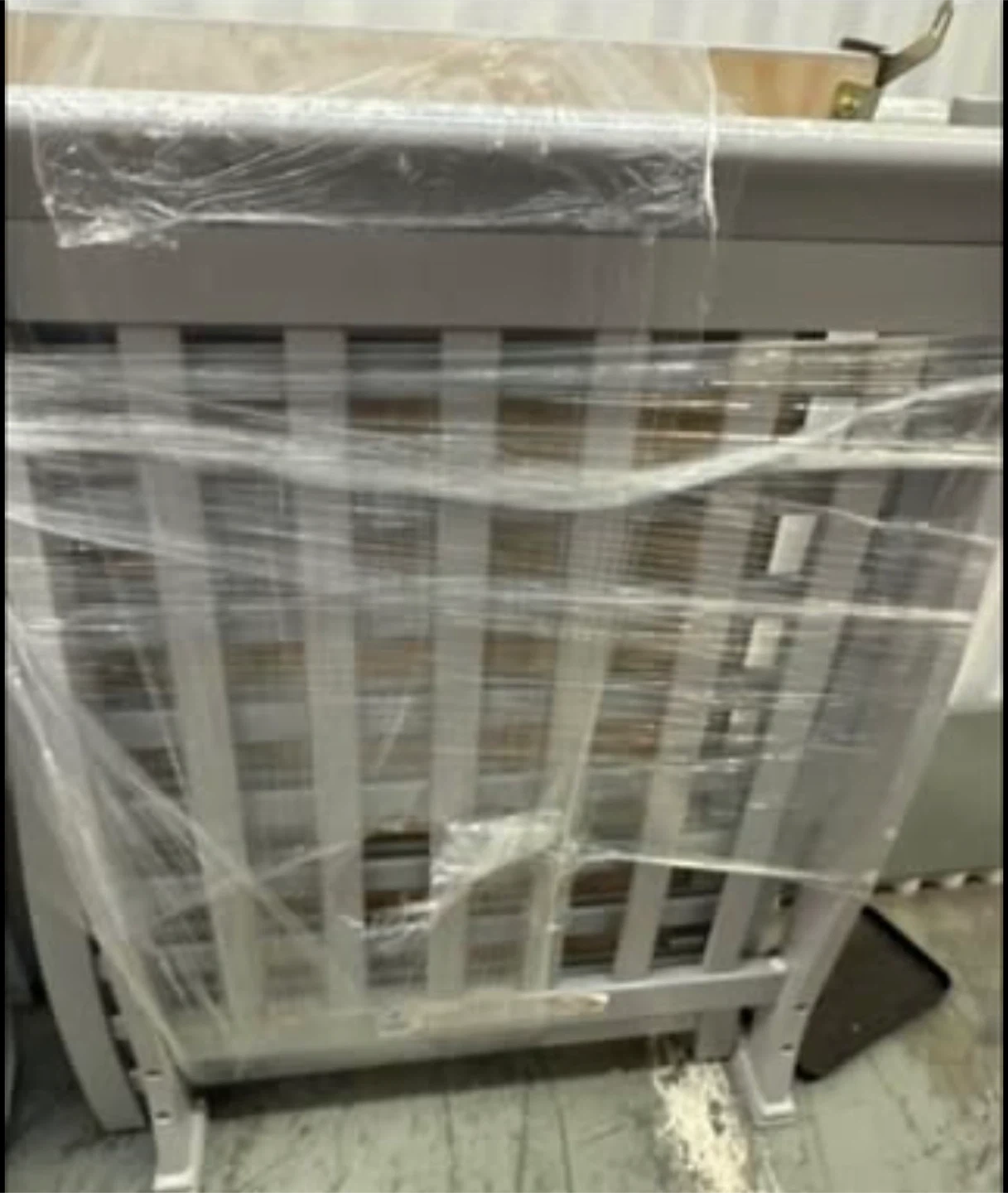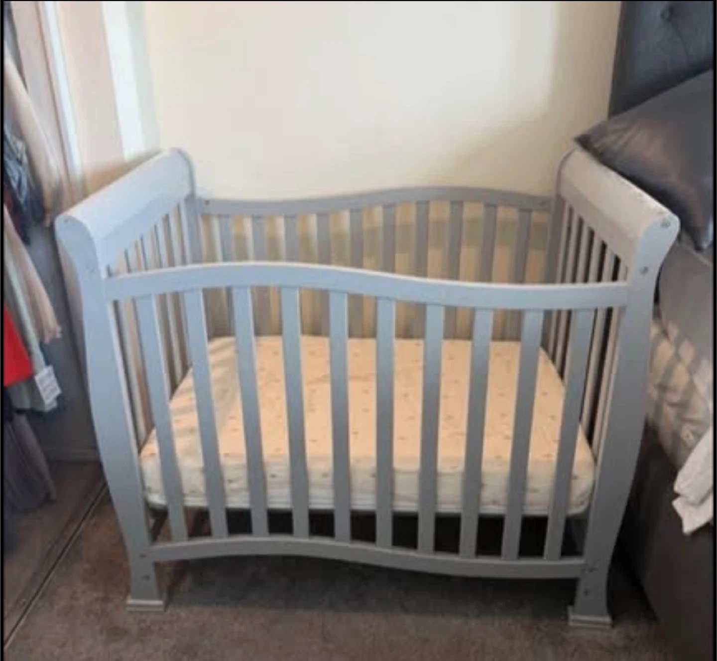 Grey mini crib with mattress not included. Its slatted design is safe for babies. It's disassembled and wrapped in plastic and ready for a new home. Has some minor paint imperfections but with a little paint can be good as new again. Here are the mattress dimension 40"l x 25"w x 36"h which can be found on Amazon. Cash only pick up.