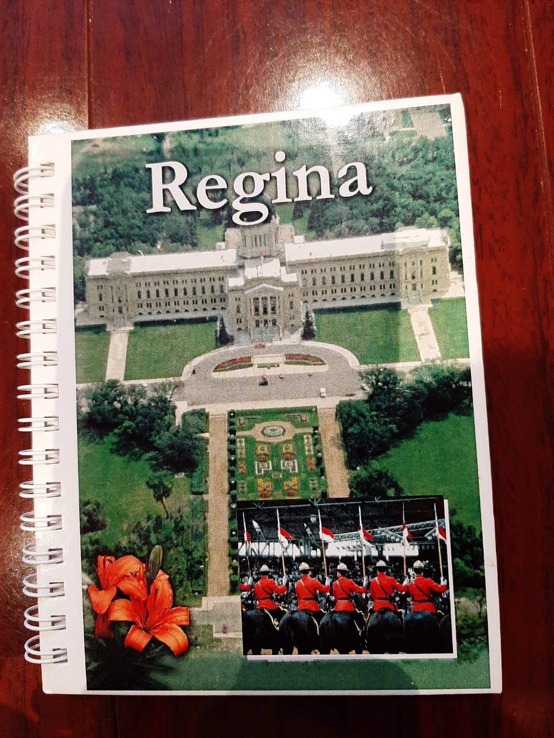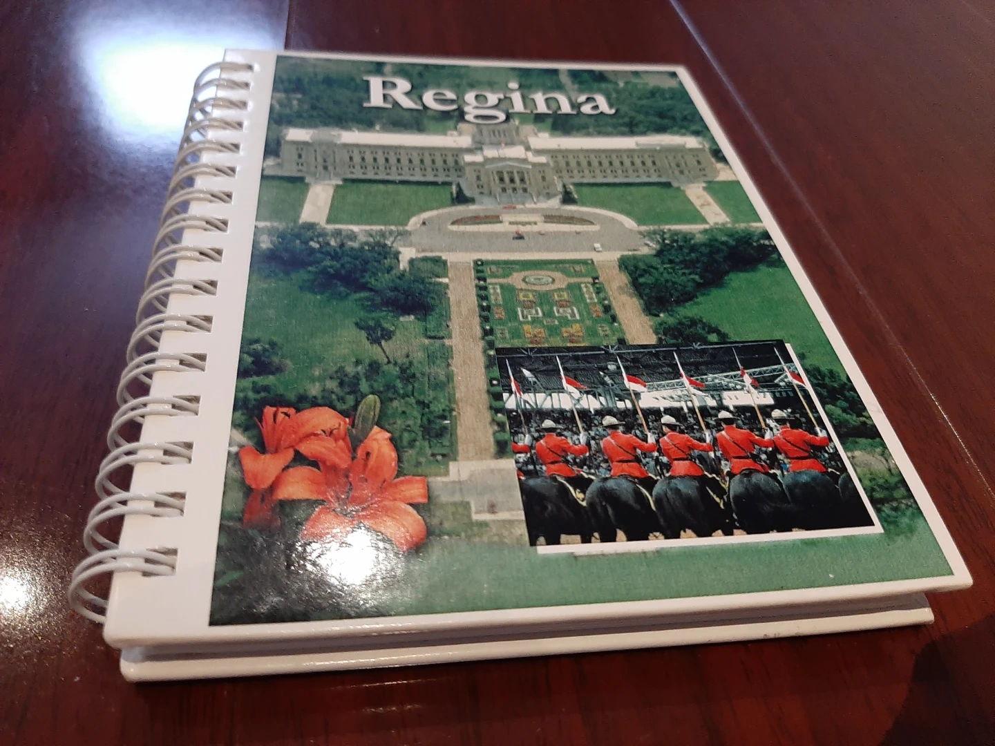 This spiral address book features a cover image of the Saskatchewan Legislative Building and the RCMP Musical Ride. It's perfect for jotting down phone numbers. Wire binding keeps pages secure.