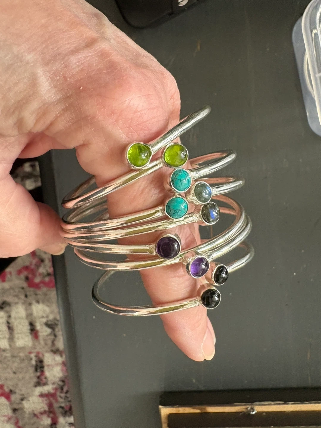 This is a set of 6 silver stacking bangles. Each bangle is adorned with a different gemstone, including peridot, turquoise, labradorite, amethyst, and black onyx. They're designed to be worn together or individually for a versatile look.