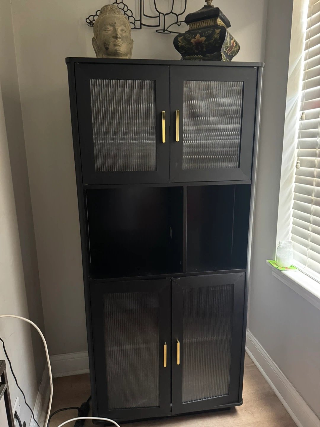This tall black cabinet features fluted glass doors on the top and bottom sections, each with gold bar handles. Also features built in lighting. It has open shelving in the middle. It's a stylish storage solution! Perfect for entertaining to hold glassware and alcohol