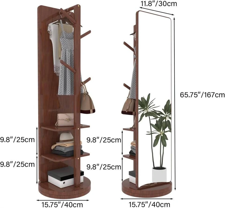 Brand new 360° rotating coat rack with full-length mirror, solid wood base, and built-in storage. Great for entryways or bedrooms. Full dimensions: 66.1"H × 15.7"W × 15.7"D. Mirror dimensions: 63.4"H × 11.0"W. Weight: 16 kg (35.3 lbs). Mirror rotates on base (360°). Material: wood. Wood colour: please see photo 4 for exact wood tone/colouration. Pickup can be coordinated in North York, West Scarborough, or downtown Toronto. Feel free to message if you have any questions!