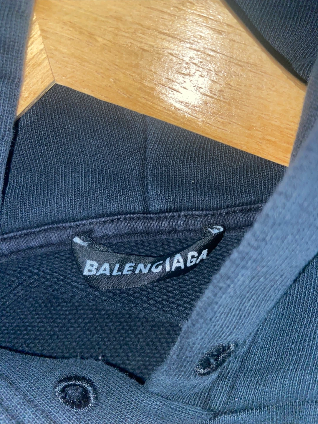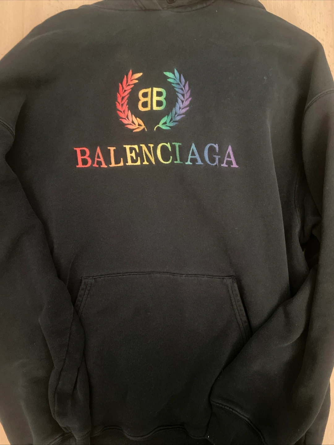 This is a black Balenciaga hoodie with a rainbow logo design on the front. It's a pullover style with a front pocket. 100% cotton material.