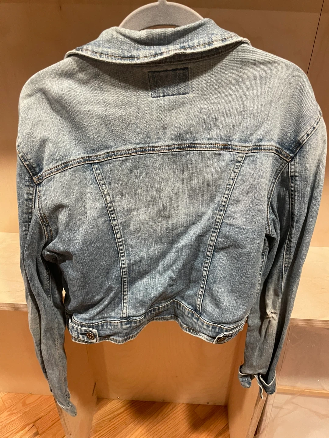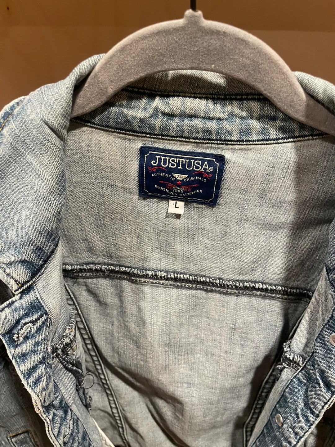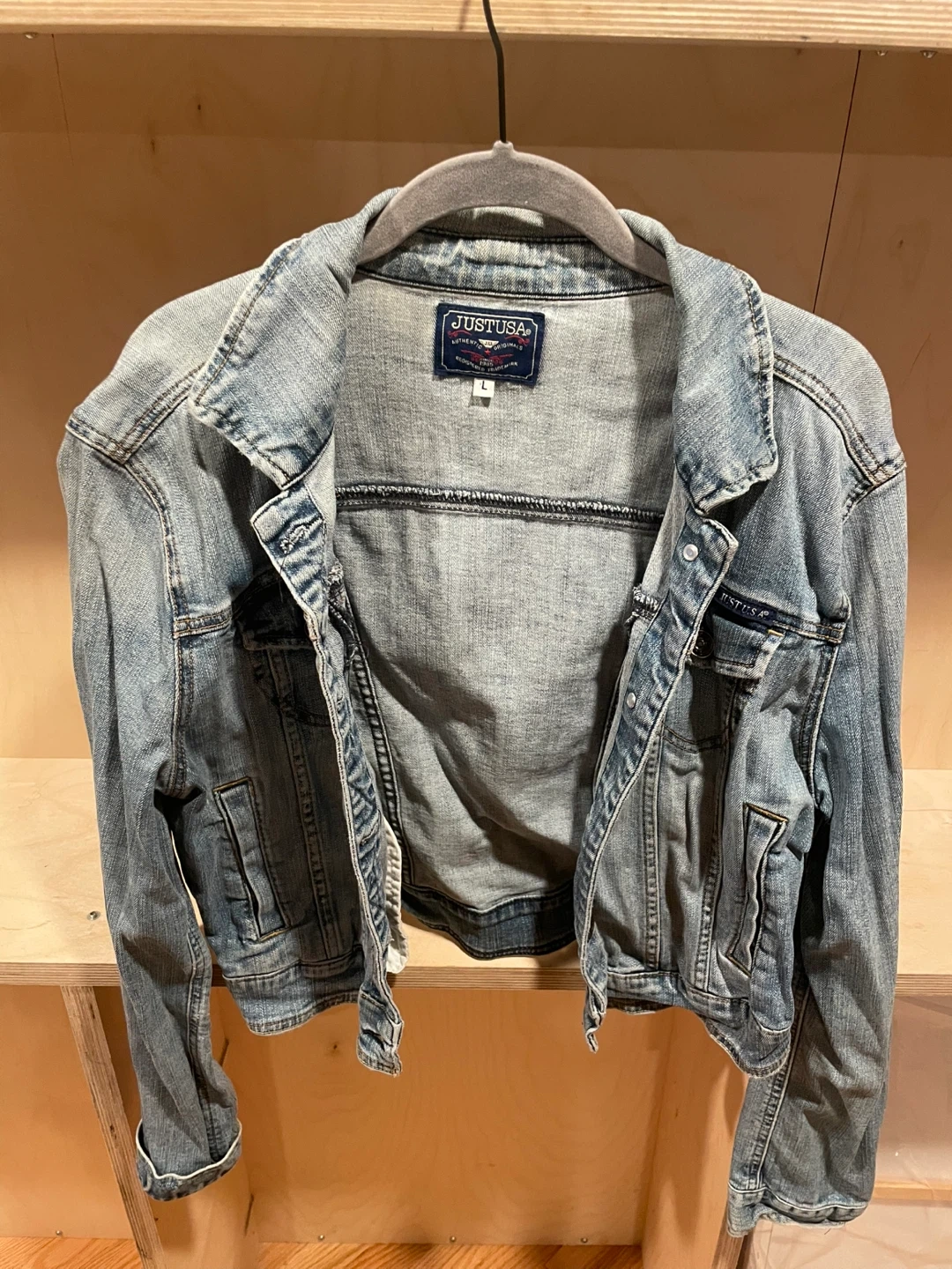 This is a light wash denim jacket from JUSTUSA. It's a size large. It features a classic collar and button closures. The jacket is made of denim.