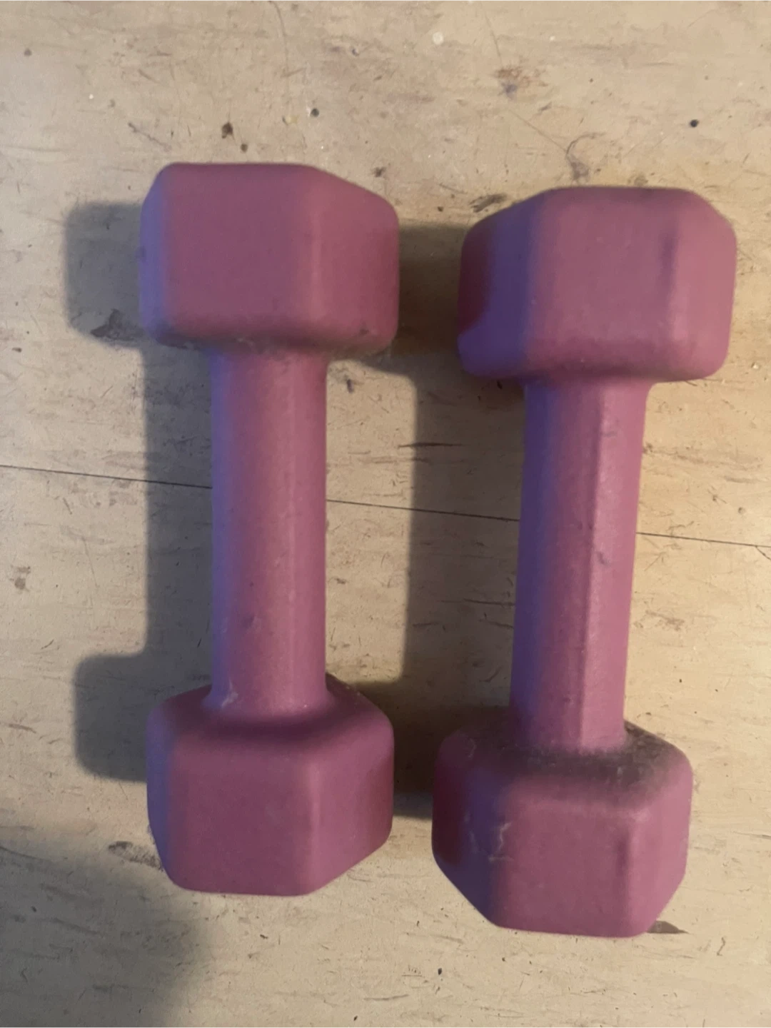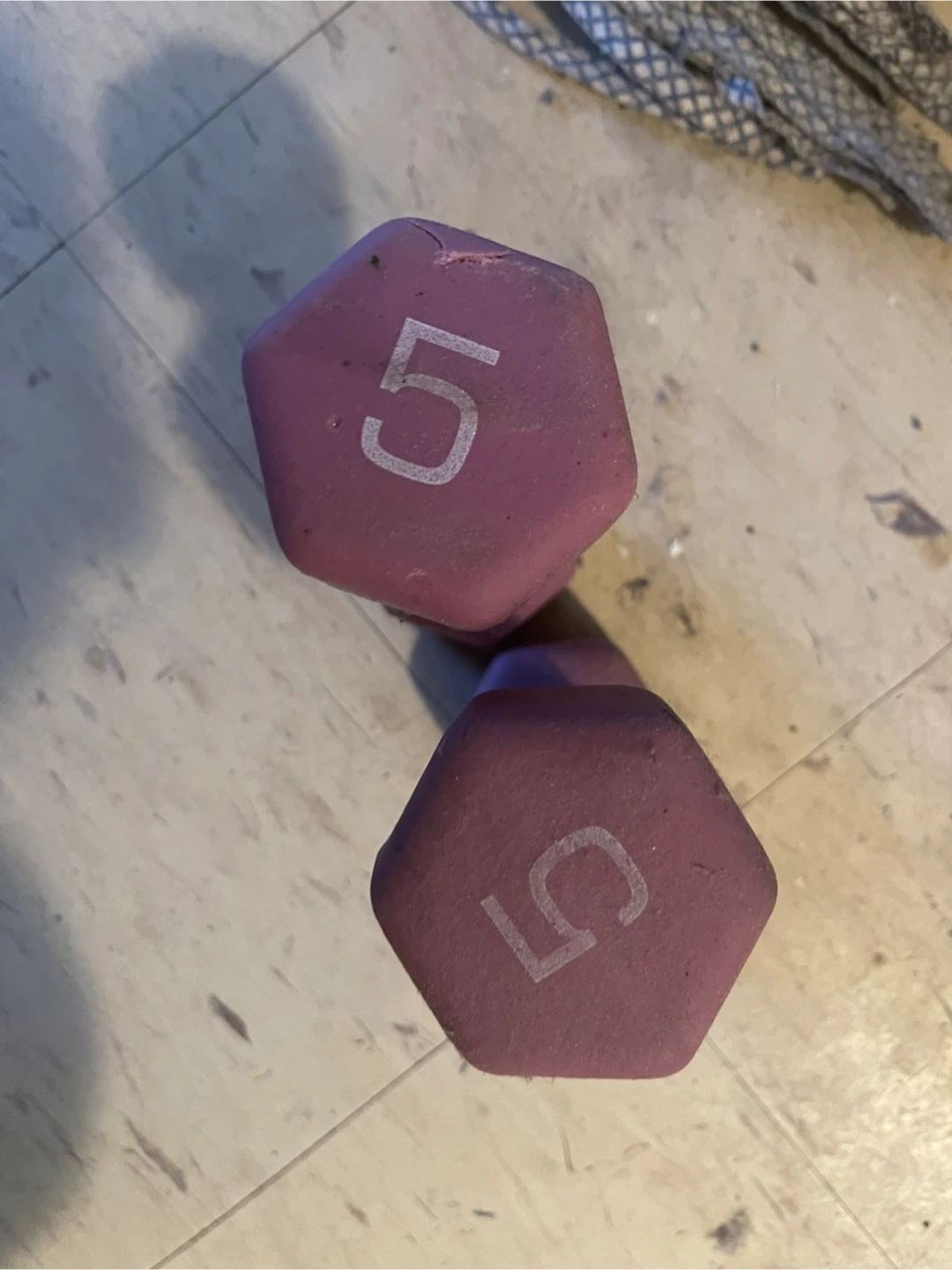 Two pink dumbbells, each weighing 5 pounds. Hexagonal shape prevents rolling.