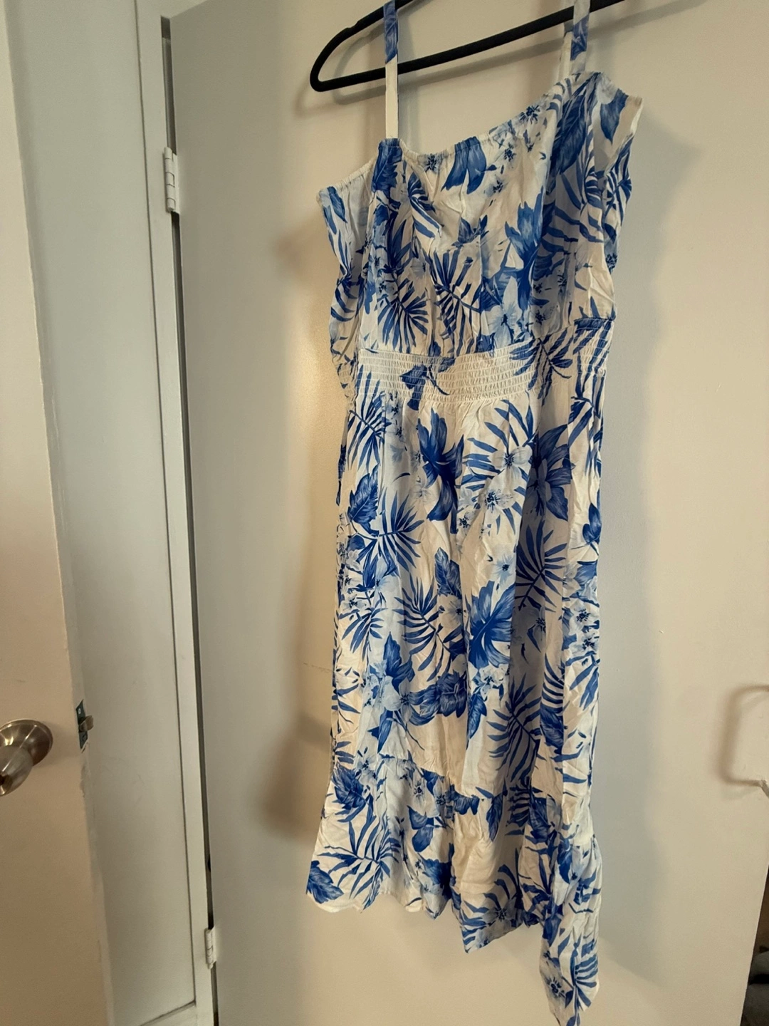 Matching set. Blue floral print on white background. Summery and lightweight. Dress is sleeveless with a smocked bodice. Polo shirt has short sleeves and a collared neckline.