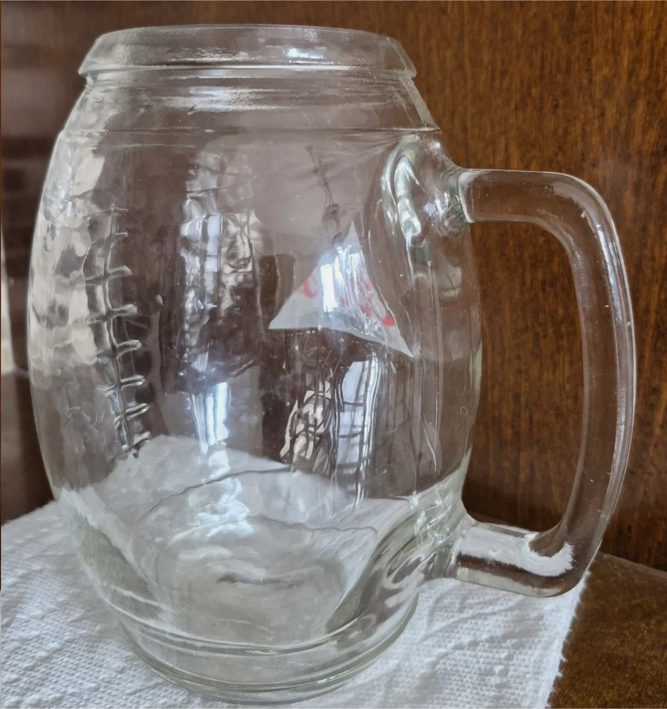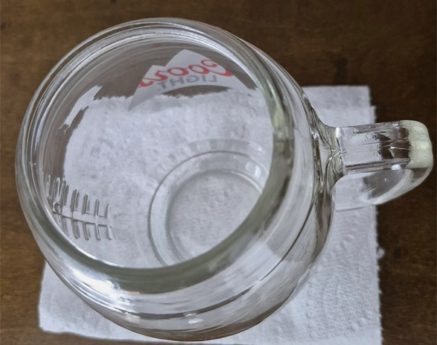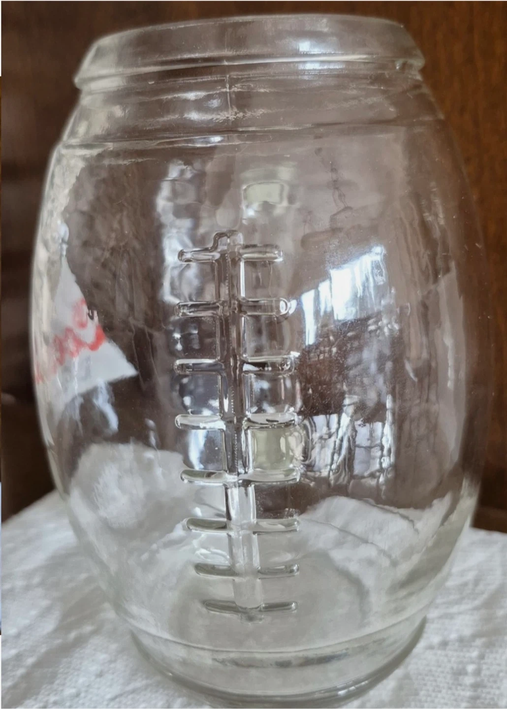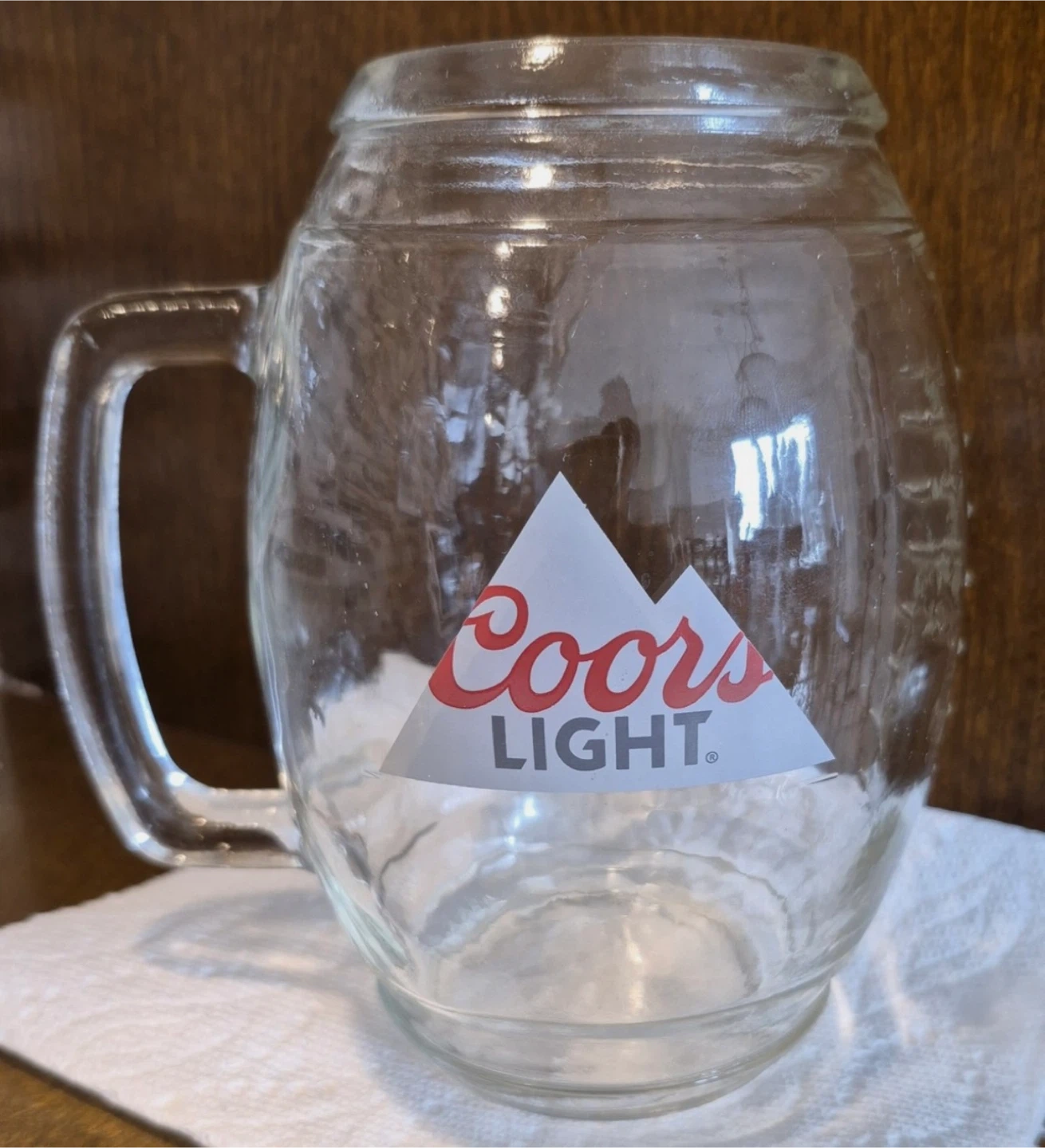 This clear glass football shaped beer mug features the Coors Light logo. It has measurement markings on the side. This mug is great for enjoying your favourite cold beverage!